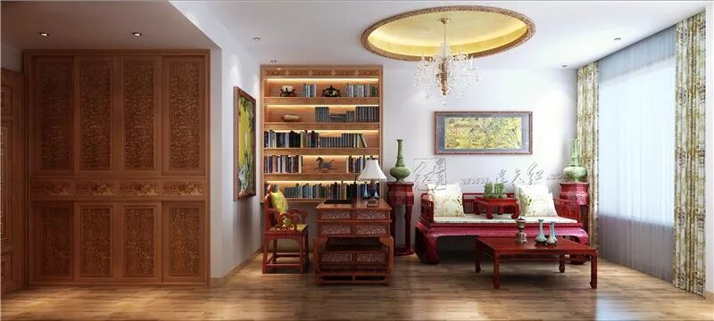 明式家具陈设讲究均匀、平衡之美,如书房布局,就讲究高低错落有致。居于书房核心的便是占地面积最大的办公桌,办公桌的背后居中的是一把高大的官帽椅,再往后就是贴墙摆放的一对书架,高有书架低有办公桌,最简单的书房家具布局同样演绎着高低错落的不均衡之美。