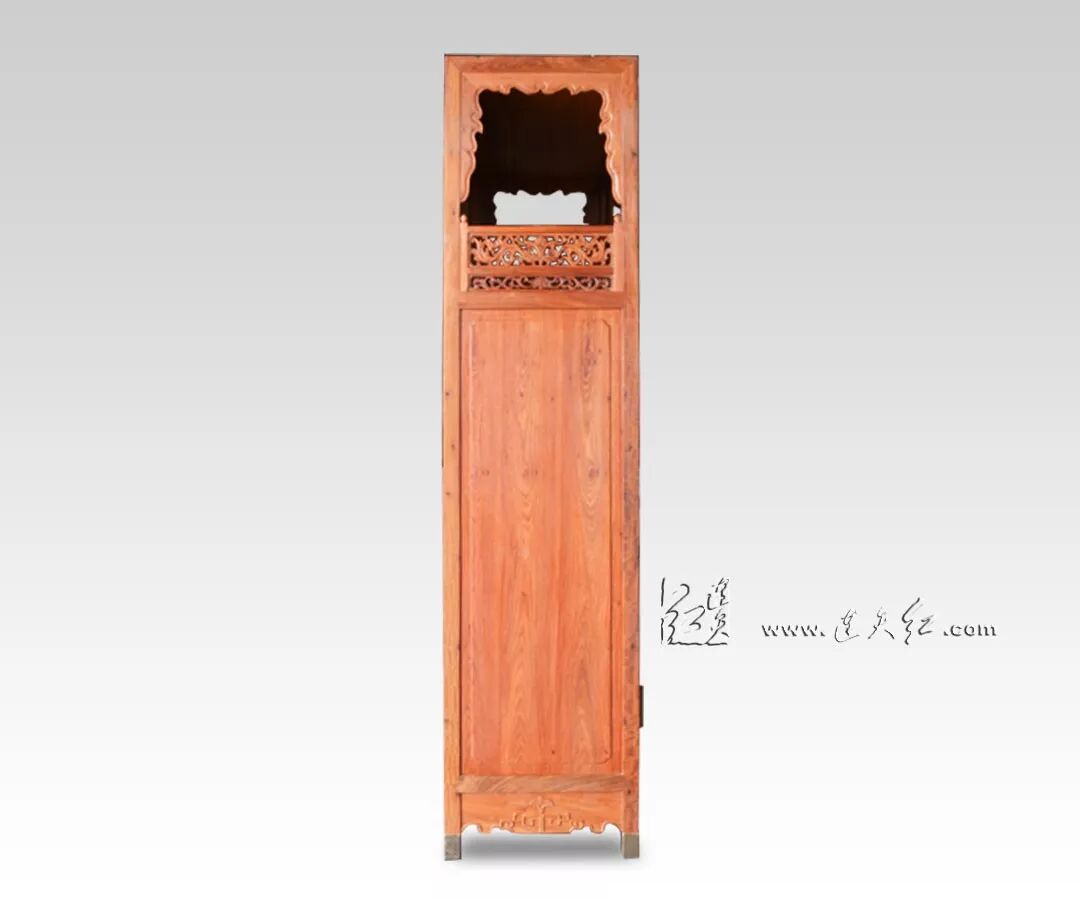 此柜格外观稳重大方,纹饰素雅。其用途,上格用于陈列古物或置用佛龛,下柜用于储物,是书房、客厅的必备家具。
