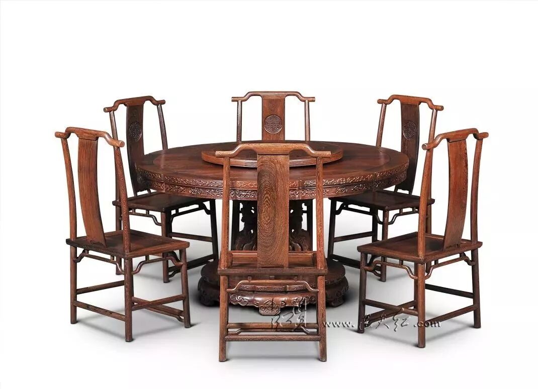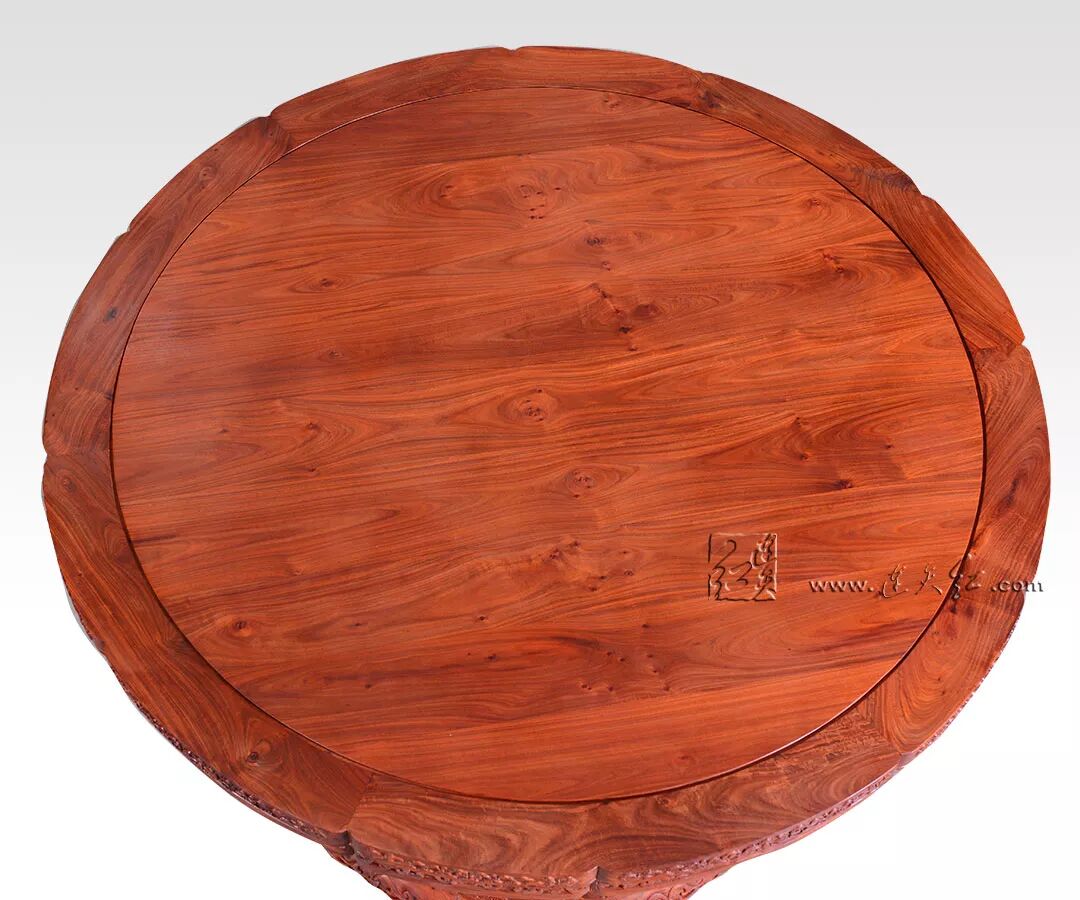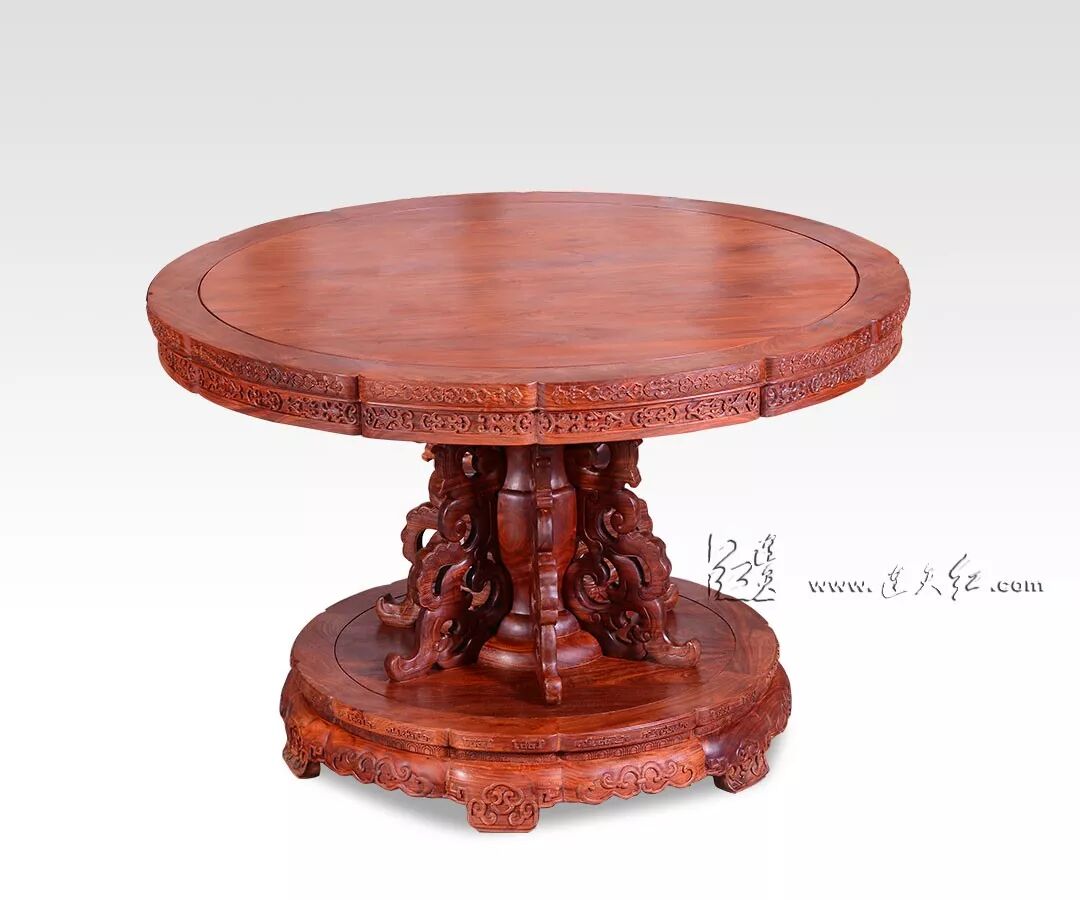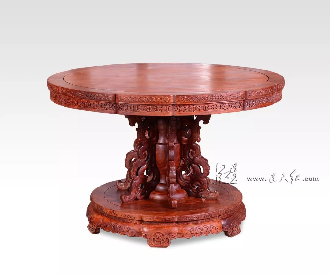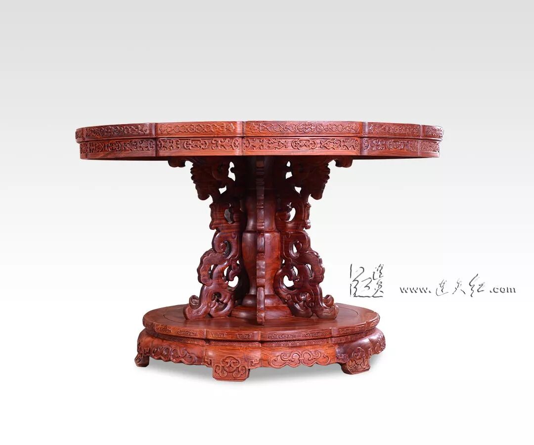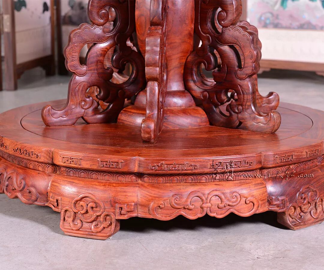 桌面葵花形,双层冰盘沿雕饰花卉纹及夔龙纹;面上增设圆形转盘,光素无雕饰。面下正中为圆柱式独腿,分两节,上节以六个花草纹花角牙支撑桌面,下节以六个站牙抵住圆柱。下承葵花式须弥座,座下为壶门式牙子带龟角,分别雕饰拐子纹、莲瓣纹及如意云头纹。
