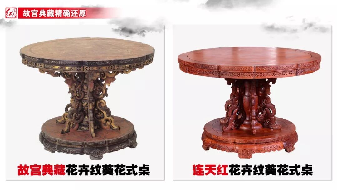 《是一是二图》原景重现中的彩漆描金花卉纹葵花式桌,即为雍正时期的家具。桌子的设计非常巧妙,中间有轴,从腰部处分为两节,上半部分可以转动。葵花形桌面每隔一片花瓣就有一个抽屉,屉内为黑漆描金,绘有精美图饰。