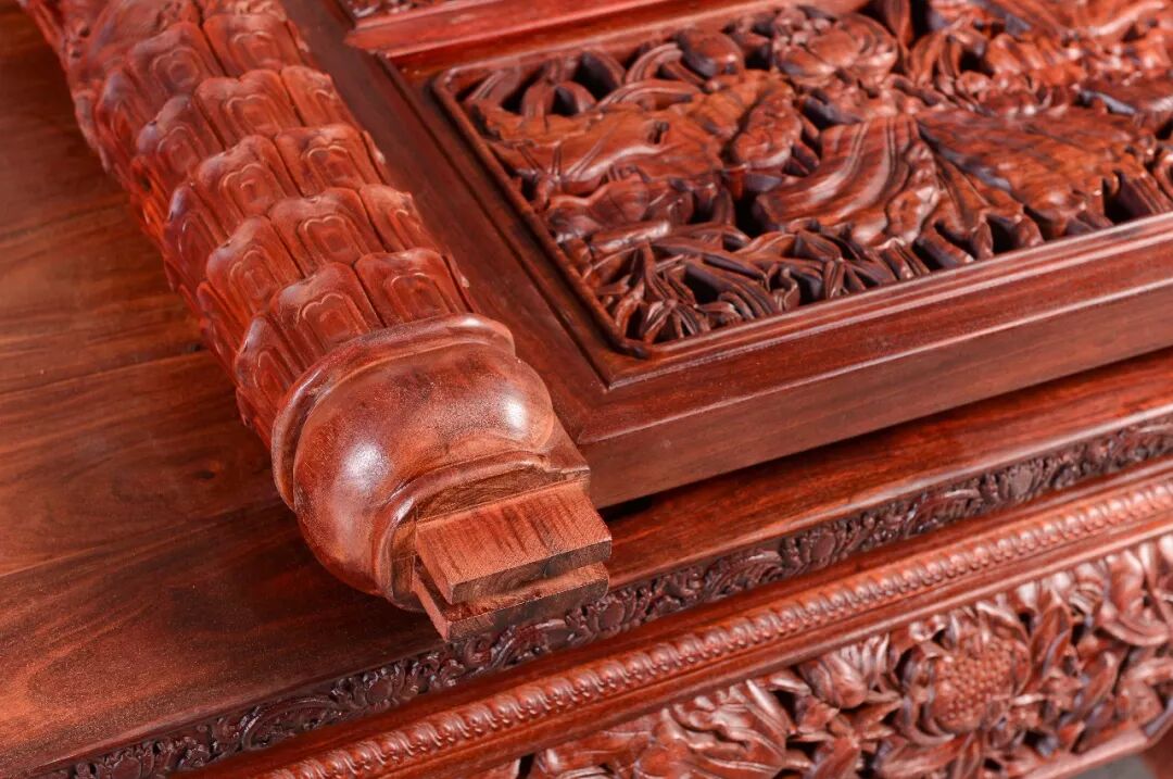 红木家具制作工艺的核心就是榫卯结构,尽管用的材料是红木,但没有榫卯结构的红木家具不能称为红木家具。红木家具的榫卯工艺是世界家具之最,工匠师们能精妙地设计出既互避互让,又相辅相成的榫子,仅凭榫卯就可以使构件之间做到联结合理、扣合严密、天衣无缝、间不容发。通过榫卯相连,不用一颗钉子便可将家具组装起来。榫卯结构的家具,经历几百年甚至上千年依然牢固紧密,而且可以在不损伤家具的前提下拆装、修复。我国榫卯结构的起源比汉字发源还早,榫卯结构是顶级工艺的化身。发展至今,红木家具榫卯结构的基本形制就有近百种,且派生种类极多,常见的有格角榫、托角榫、粽角榫、燕尾榫、夹头榫、抱肩榫、龙风榫、楔钉榫、插肩榫、围栏榫、套榫、挂榫、半榫与札榫等。如:抱肩榫是有束腰家具的腿足与束腰、牙条相结合时使用的榫卯结构。也可以说是家具水平部件和垂直部件相连接的榫卯结构。