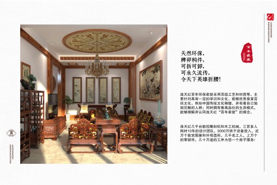 连天红百年环保家装:为有学识有文化、能够欣赏皇室宫廷文化、熟知传统文化精髓、并有着自己独到见解,同时拥有着高品位的生活模式的人士服务,根据客户自身喜好、特有气质等量身定制设计独一无二的中式家装。