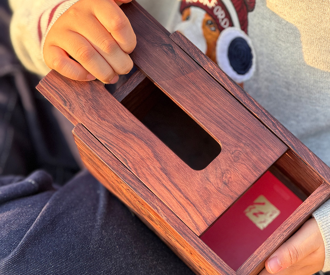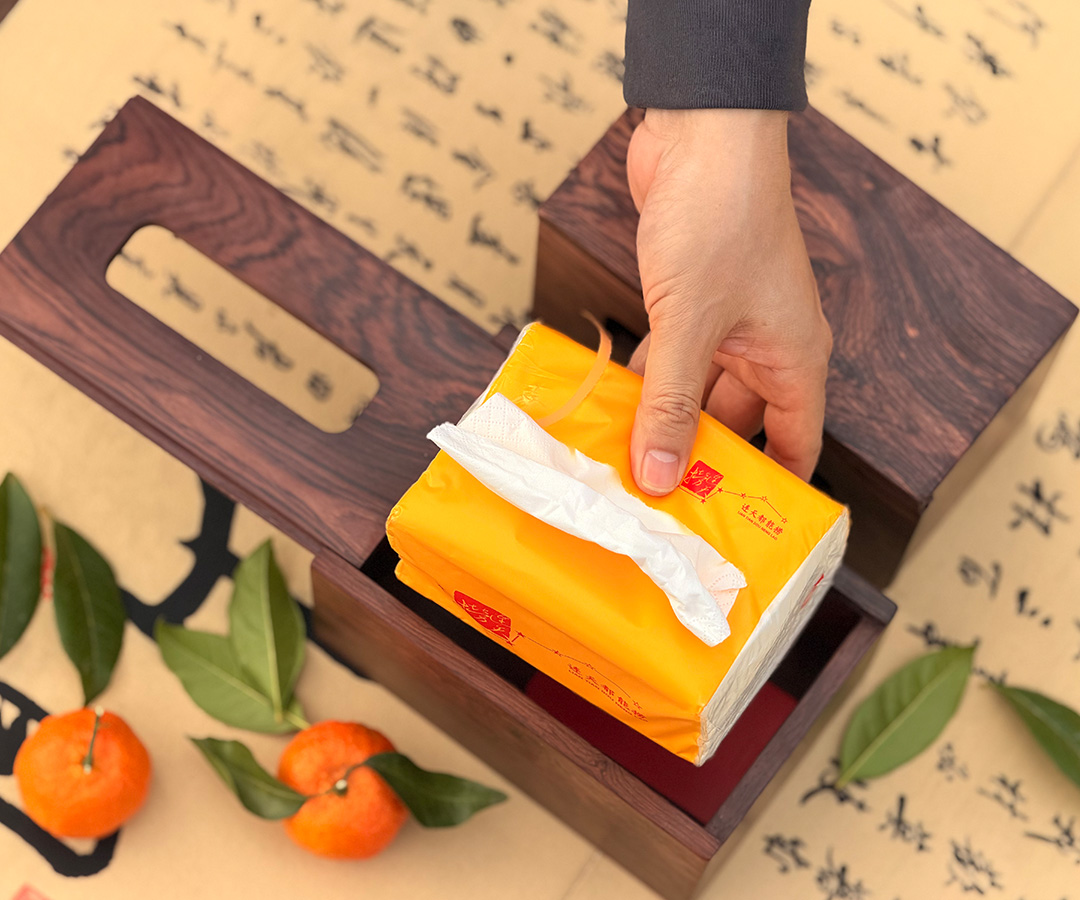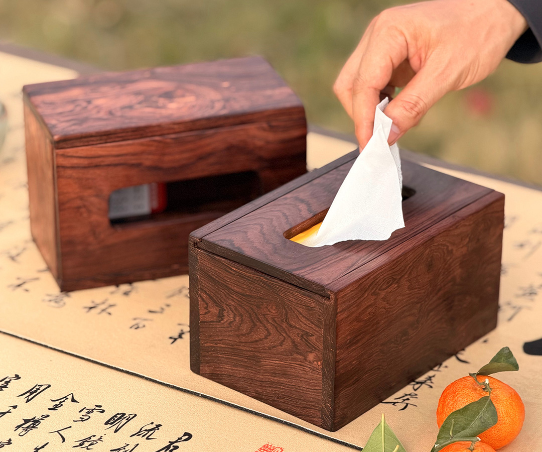 器型: 长方体雅盒,顶面开抽纸口,侧边挖嵌入式提手 —— 既是桌面的雅致收纳盒,也能手提便携,随带随用不占空间。盒内可藏纸巾,也能轻纳小物,实用里藏着巧思。适配: 茶桌旁取纸添茶,野餐时提盒随行,书房里藏香笺小物 —— 把日常琐碎归置得妥帖,让中式雅意落进每一处生活场景。