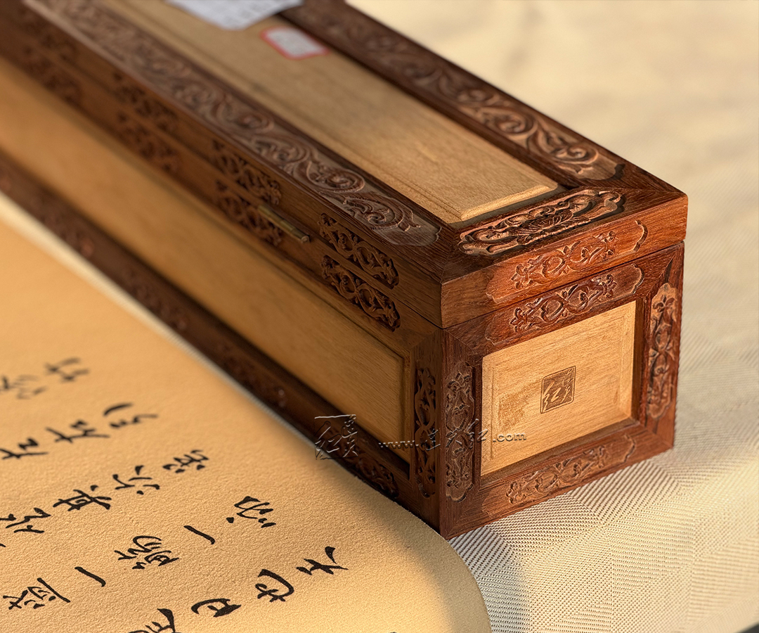 采用天然香樟木,纹理清晰,自带淡雅清香,防潮防蛀。全手工深浮雕工艺,盒身四周雕刻缠枝宝相花纹,线条流畅,层次分明;边角处饰以传统吉祥纹样,寓意雅致隽永。长条形双开结构,铜质合页与锁扣,开合顺滑,兼具实用性与仪式感;内部空间规整,可收纳卷轴、字画、香品或珍贵文玩。