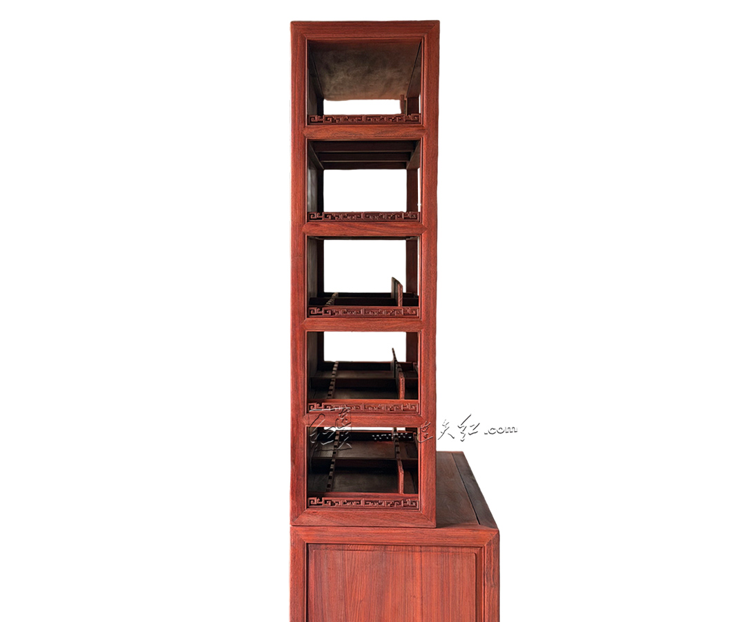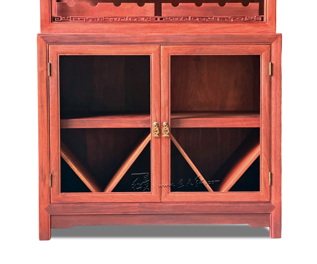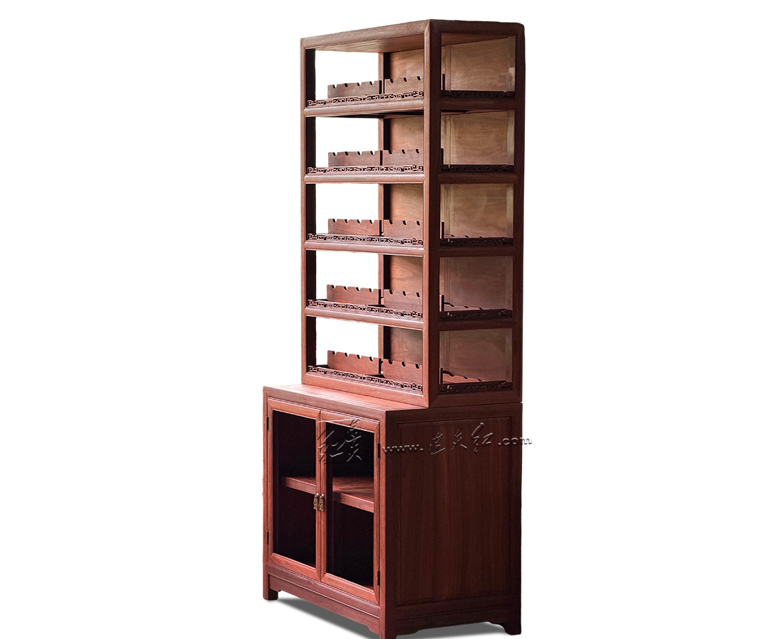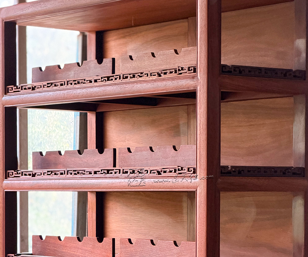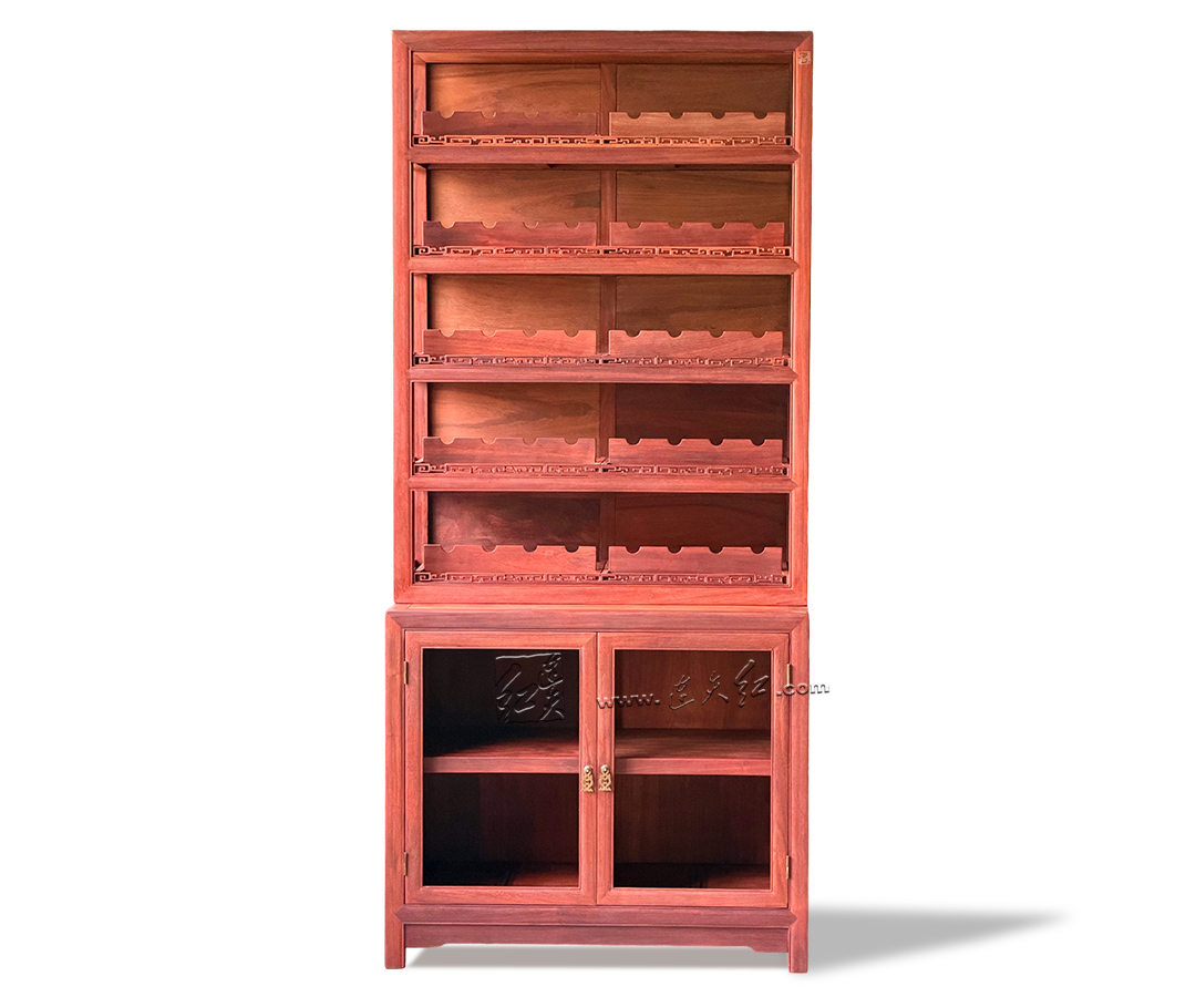 【分层收纳,一物多用】:上层五层开放式格架,每格配专属齿形承托,可规整存放普洱茶饼、白茶饼,也可陈列红酒、茶具、文玩摆件,分类清晰、取放便捷;下层双门玻璃柜,通透防尘,可收纳藏酒、茶器、书籍,兼顾展示与收纳。 【明式美学,细节点睛】:柜沿雕回纹万字纹,线条流畅、寓意吉祥,为简约柜体增添中式韵味;黄铜五金配件,质感厚重、开合顺滑,与红木相得益彰;玻璃柜门通透雅致,既防尘又不遮挡藏品之美。 【结构稳固,适配多场景】:整体造型挺拔周正,比例协调,落地稳固不晃;尺寸适配中式、新中式等多种家居风格,茶室存茶、客厅藏酒、书房置物皆相宜,是空间里的点睛之笔。