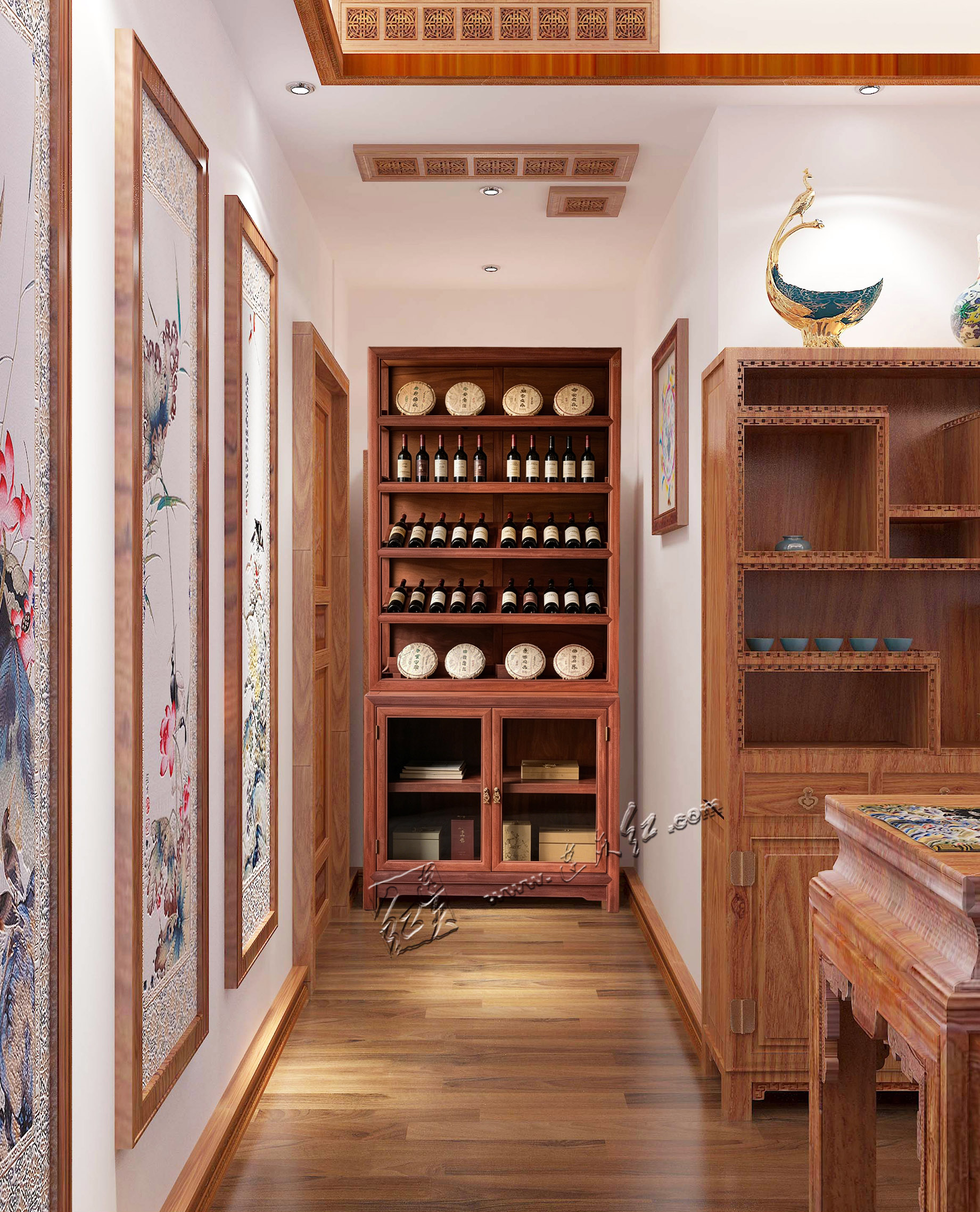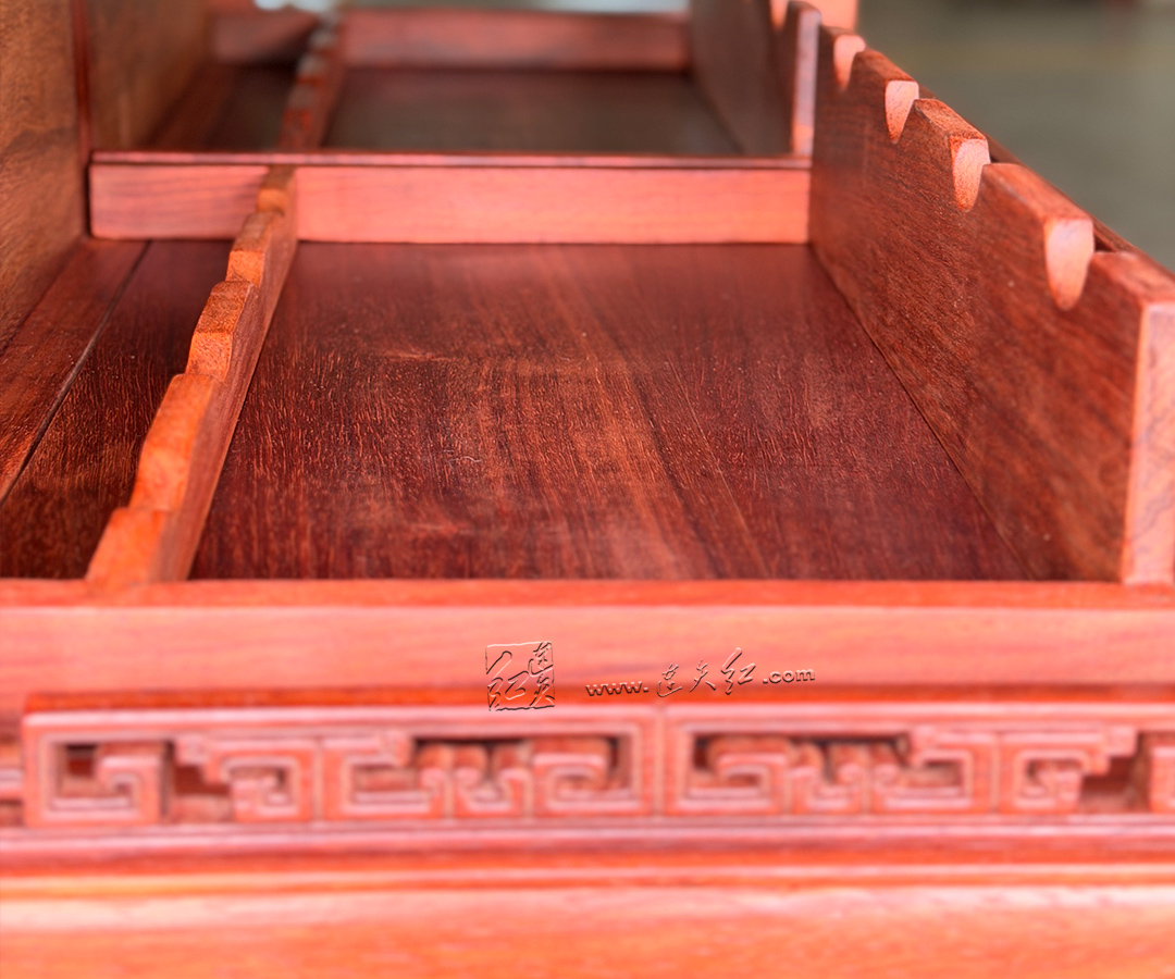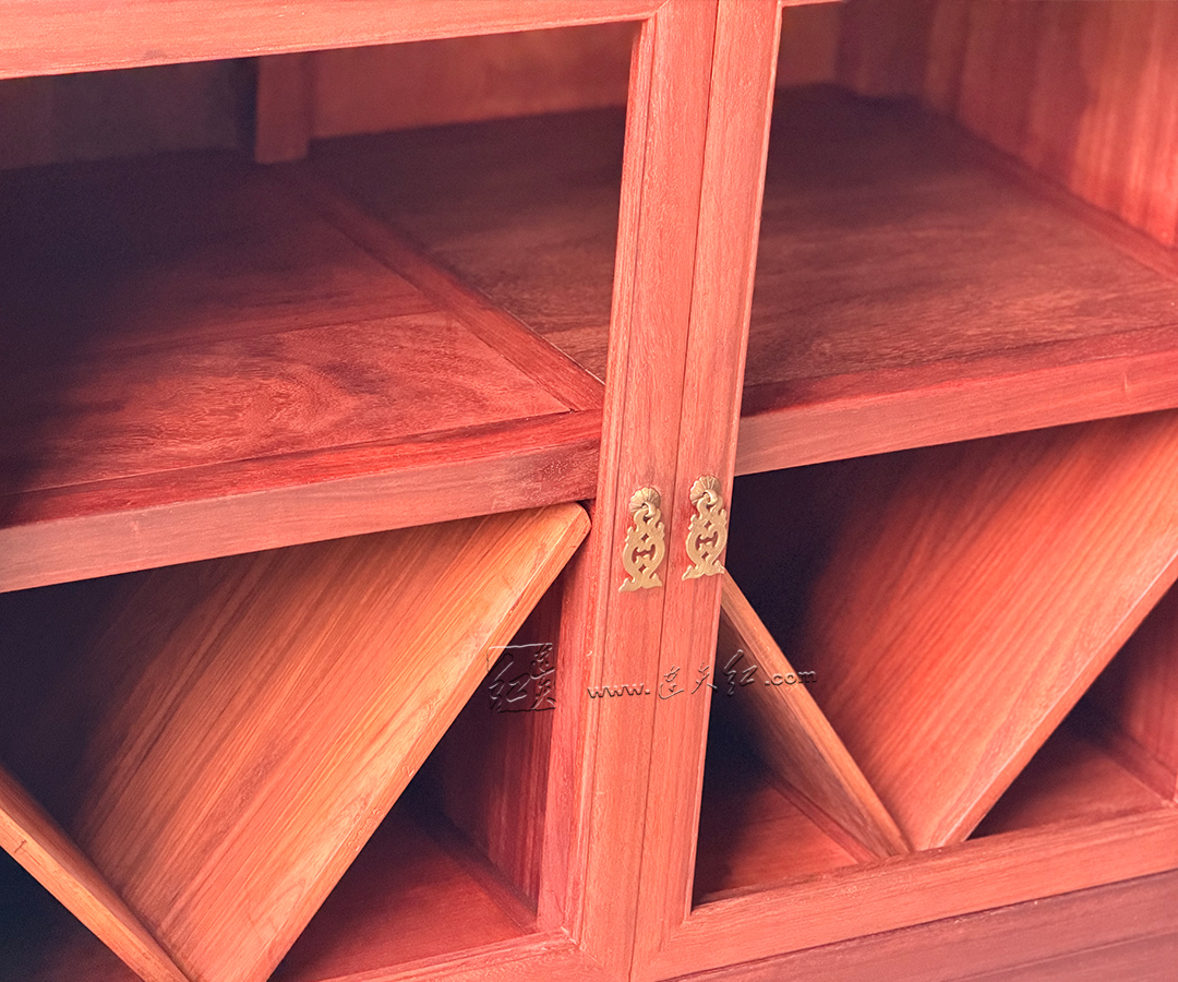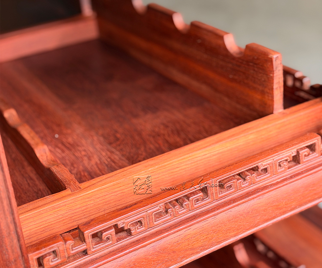 【分层收纳,一物多用】:上层五层开放式格架,每格配专属齿形承托,可规整存放普洱茶饼、白茶饼,也可陈列红酒、茶具、文玩摆件,分类清晰、取放便捷;下层双门玻璃柜,通透防尘,可收纳藏酒、茶器、书籍,兼顾展示与收纳。 【明式美学,细节点睛】:柜沿雕回纹万字纹,线条流畅、寓意吉祥,为简约柜体增添中式韵味;黄铜五金配件,质感厚重、开合顺滑,与红木相得益彰;玻璃柜门通透雅致,既防尘又不遮挡藏品之美。 【结构稳固,适配多场景】:整体造型挺拔周正,比例协调,落地稳固不晃;尺寸适配中式、新中式等多种家居风格,茶室存茶、客厅藏酒、书房置物皆相宜,是空间里的点睛之笔。
