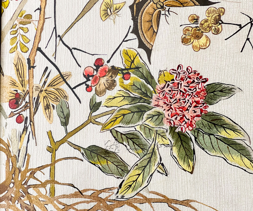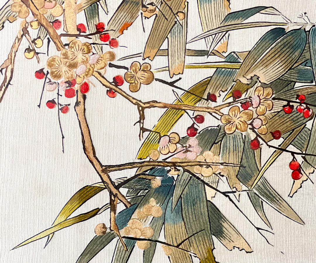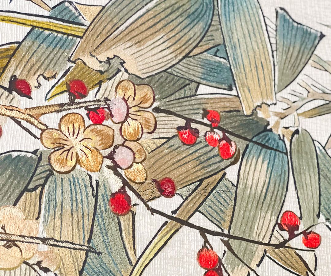 梅枝虬劲,报春迎春,寓不屈风骨、鸿运当头;青竹挺秀,节节向上,含平安顺遂、步步高升之兆;兰草幽芳,清雅自持,藏君子之德、蕙质兰心之韵。辅以簇簇瑞果繁花,更添四季繁茂、家业兴旺的美好祈愿。