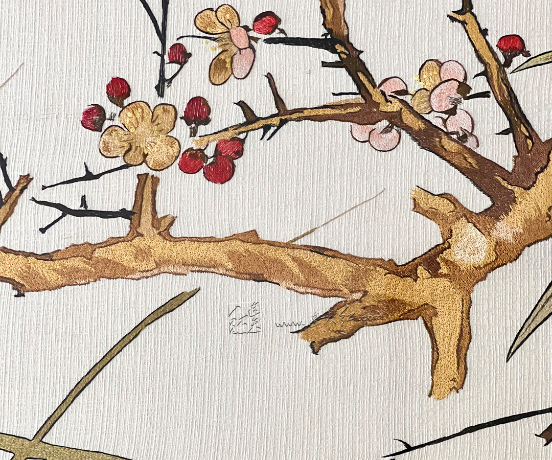 此挂屏以「岁寒三友」为核心意象,融梅、竹、兰、瑞花于一帧,取东方文人风骨与吉祥寓意为魂,是兼具审美与文化底蕴的空间雅器。