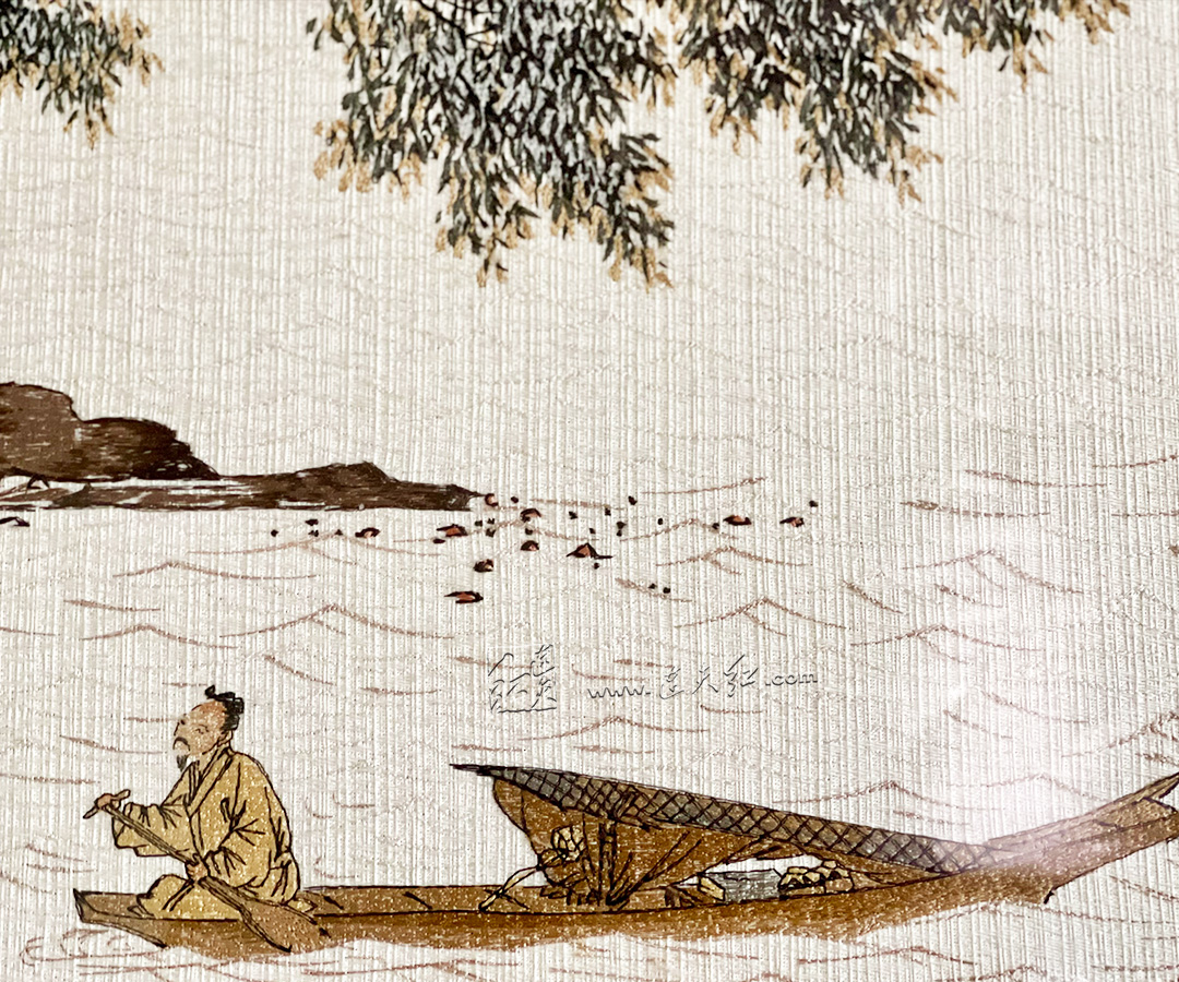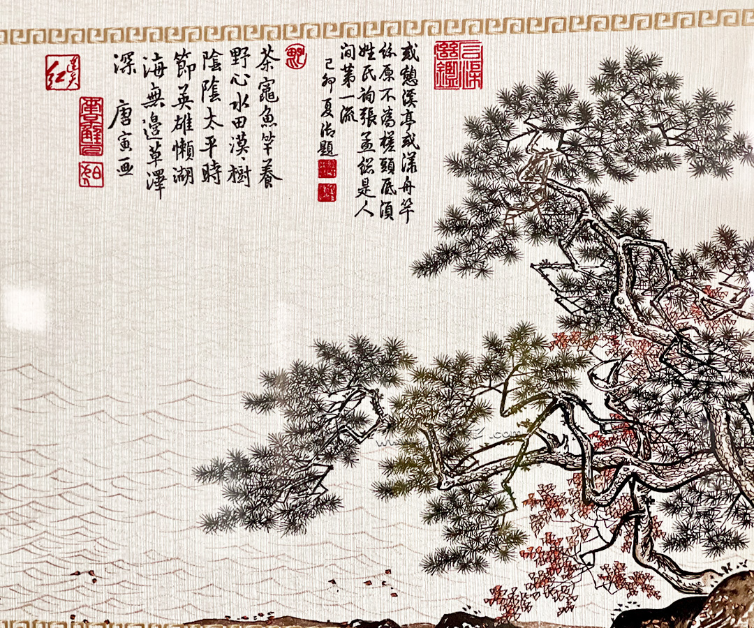 画面取松鹤延年、渔樵耕读之吉意,苍松虬劲傲立,象征基业长青、福寿绵长;溪畔幽居、扁舟垂钓,描绘出隐士高人的淡泊心境,寓意事业顺遂、心境澄明、得享闲逸。满幅诗情画意,既藏「坐拥江山、平安喜乐」的宏大祈愿,亦具「静听松风、细品生活」的文人雅趣。