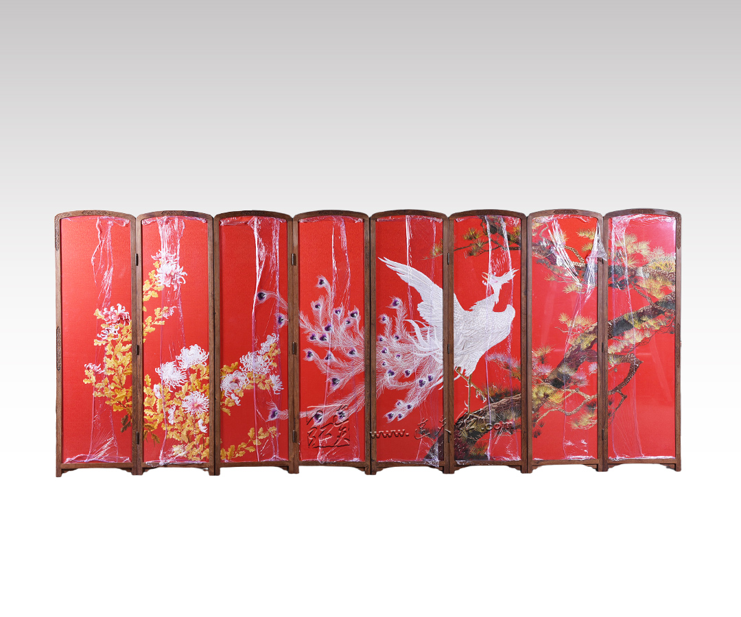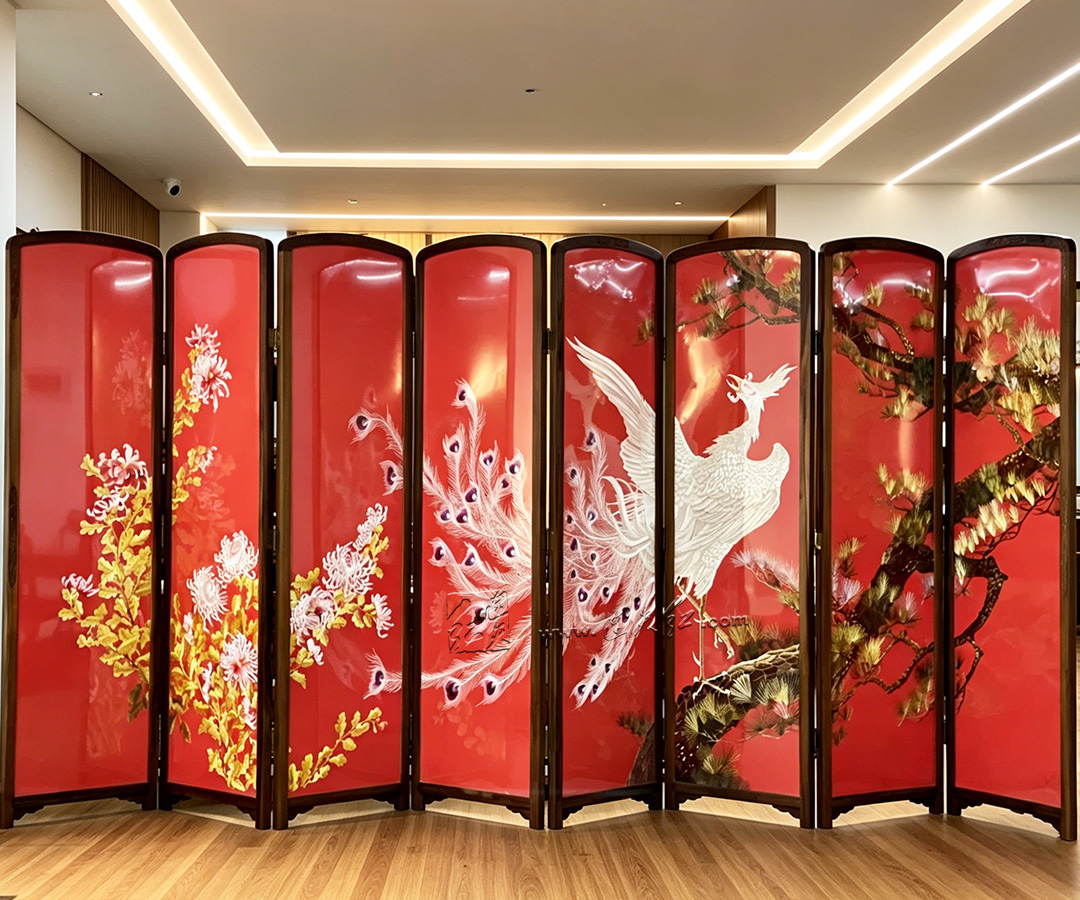 凤凰自古象征祥瑞太平、前程似锦,苍松寓意基业长青,秋菊代表延年益寿,朱红地色更添喜庆雍容之气,承载了 “国运昌隆、家宅兴旺、福寿双全” 的美好期许。此款八折围屏可自由开合、多角度摆放,既能作为中式大宅、高端会所、茶室的空间隔断,营造雅致私密氛围;亦能作为大型装饰背景,为空间注入满堂吉庆与华贵格调,是收藏陈设、乔迁贺礼的顶级之选。