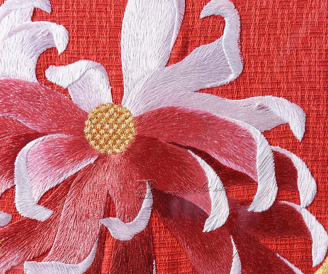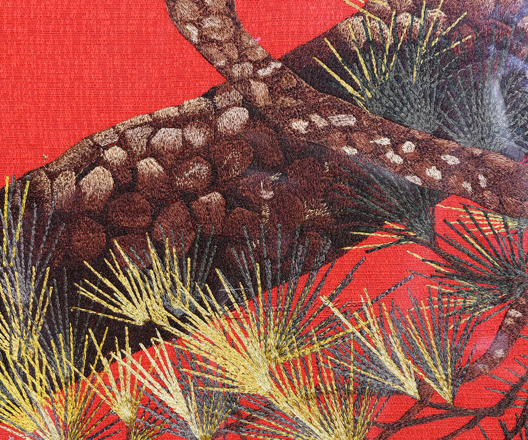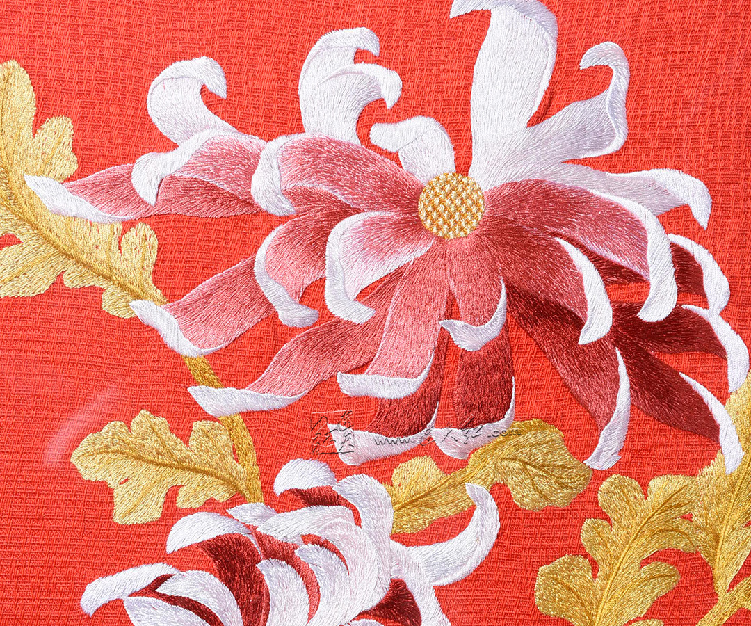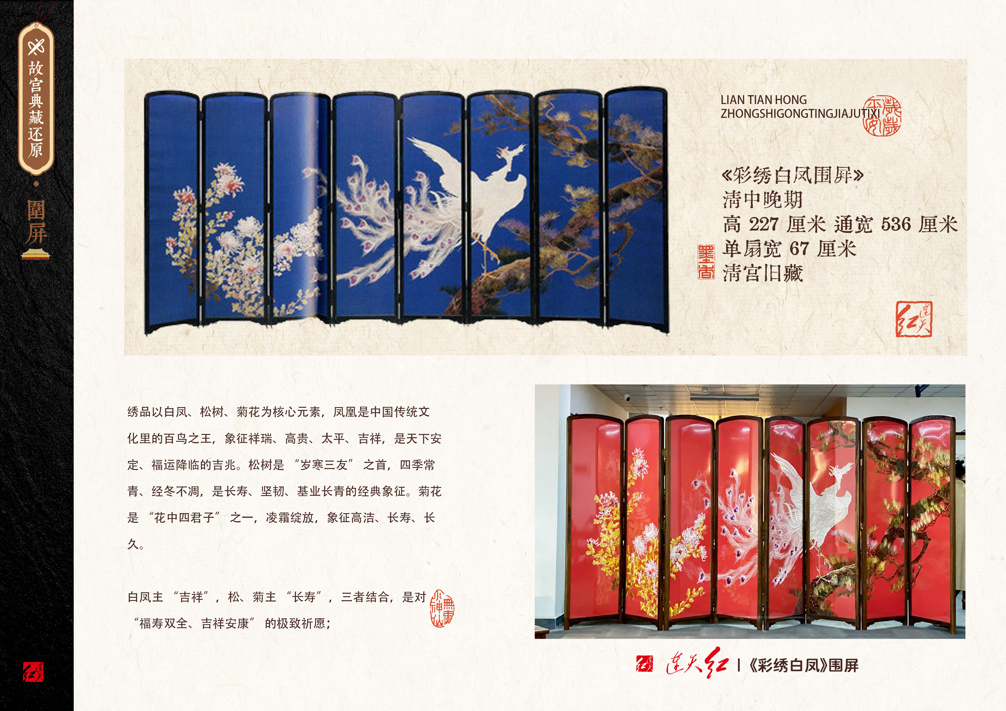 八扇屏心通体朱红为地,以针代笔、以线代墨,还原白凰松菊的神韵:苍松虬劲,枝干苍劲如铁;秋菊盛放,黄白相间,清雅动人;中心白凰立于松枝之上,昂首振翅,尾羽舒展如流云,翎羽上的眼纹以紫线点染,栩栩如生,针脚细密平整,配色富丽饱满,将 “丹凤朝阳、松菊延年” 的意境娓娓道来,还原传统刺绣 “丝理分明、色彩鲜活” 的工艺精髓。整体构图开合有度,八屏连屏合一,气势磅礴。