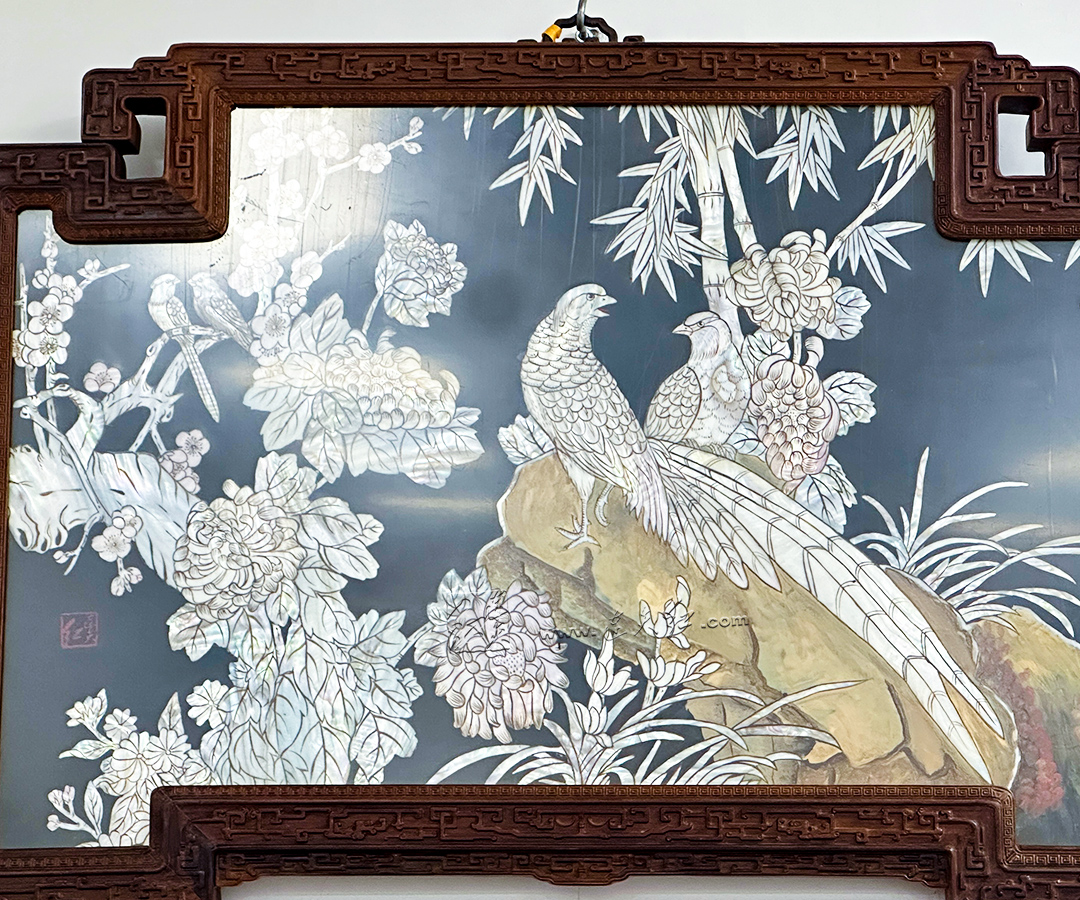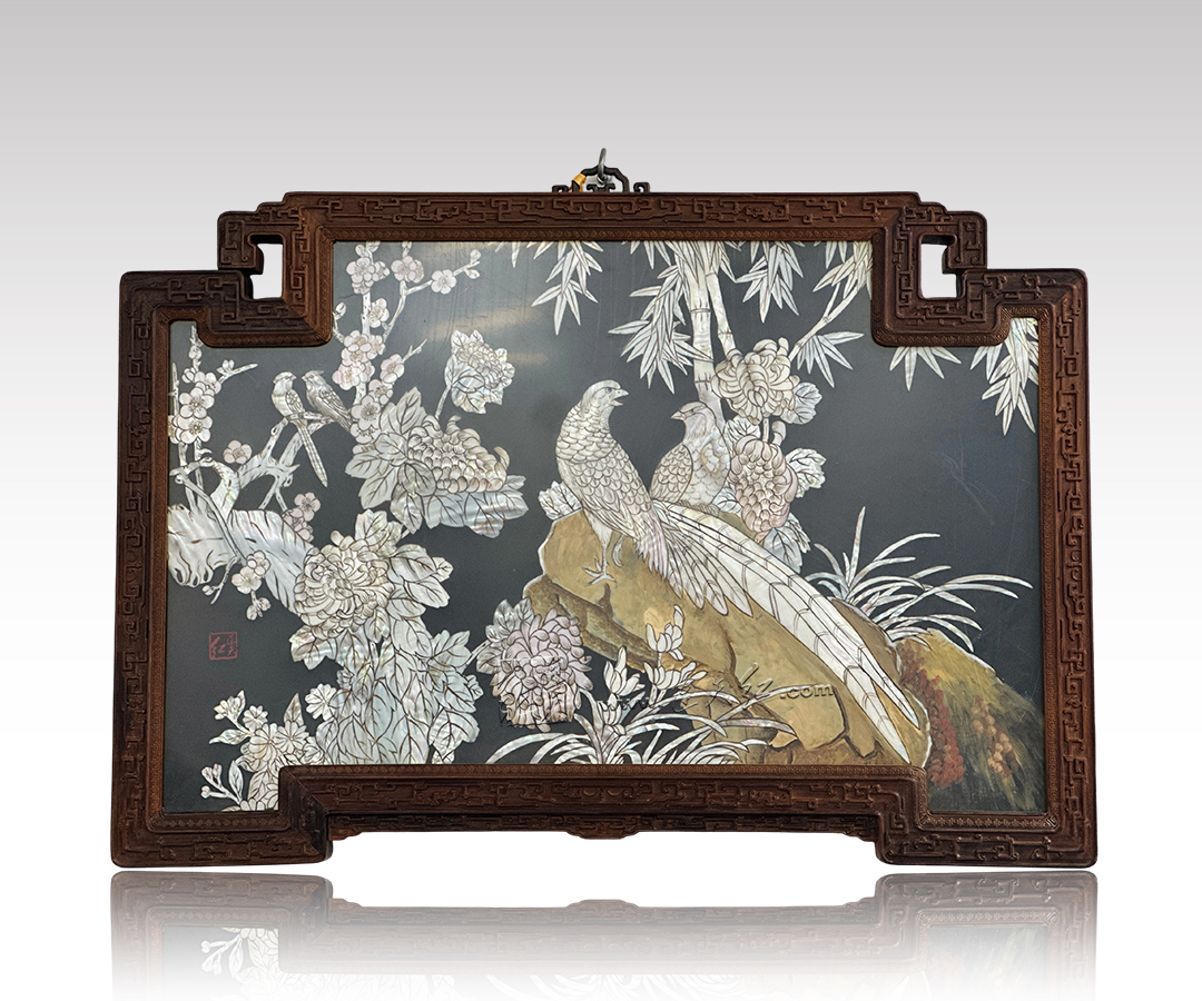 工艺溯源:螺钿镶嵌工艺自唐代已臻成熟,明清时期广泛应用于家具、挂屏等器物,以贝壳天然珠光在黑漆底上呈现细腻华美的纹饰,是扬州漆器、京作漆器的代表技艺。