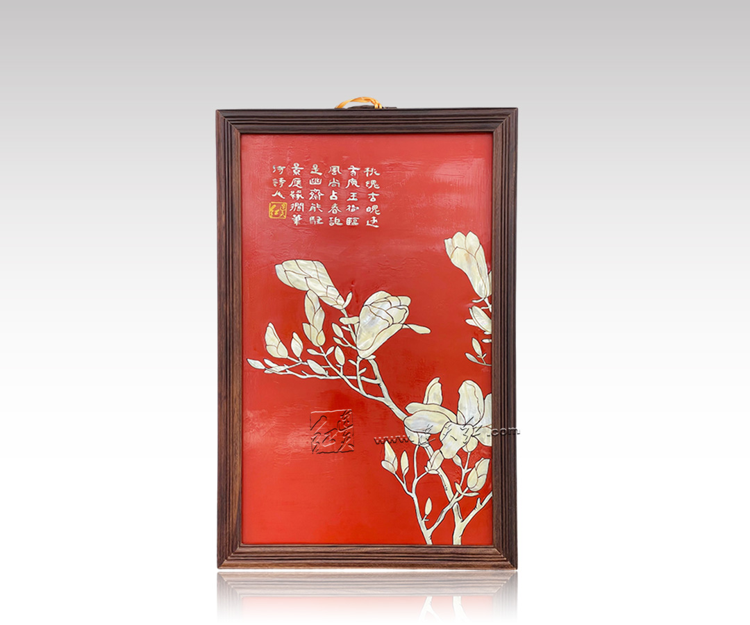 此件挂屏以螺钿镶嵌工艺为骨,以玉兰花为魂,将东方雅致美学凝于一屏。黑底为幕,贝光为韵,木框为承,既是传统工艺的匠心传承,亦是家居空间的点睛雅物,可悬于厅堂、书房、茶室,为空间注入清逸高洁的文人气息。
