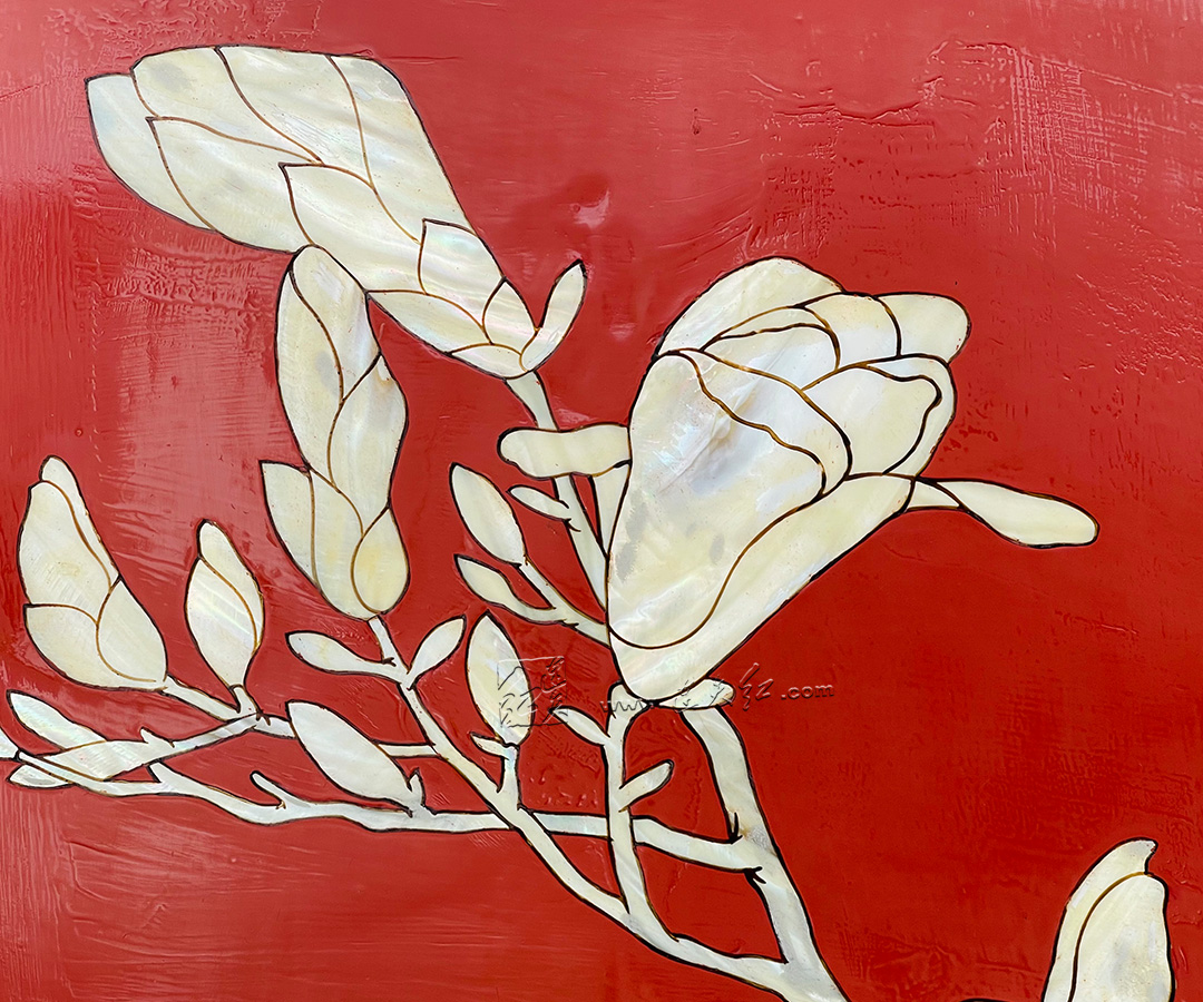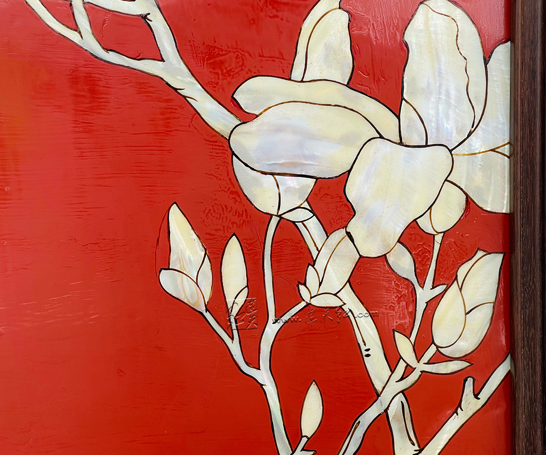 螺钿镶嵌是中国非遗传统工艺,又称 “螺甸”“螺填”,距今已有数千年历史。此作采用平磨螺钿技法: