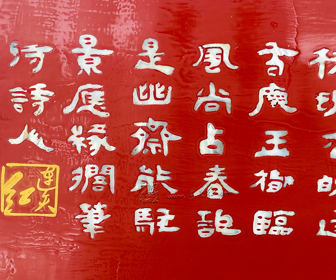 贝片天然的虹彩光泽,在不同光线下呈现温润莹润的珠光,与漆黑的漆面形成强烈视觉对比,层次分明,质感卓绝。