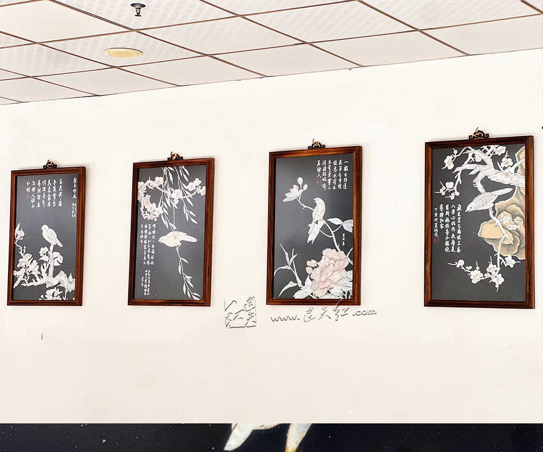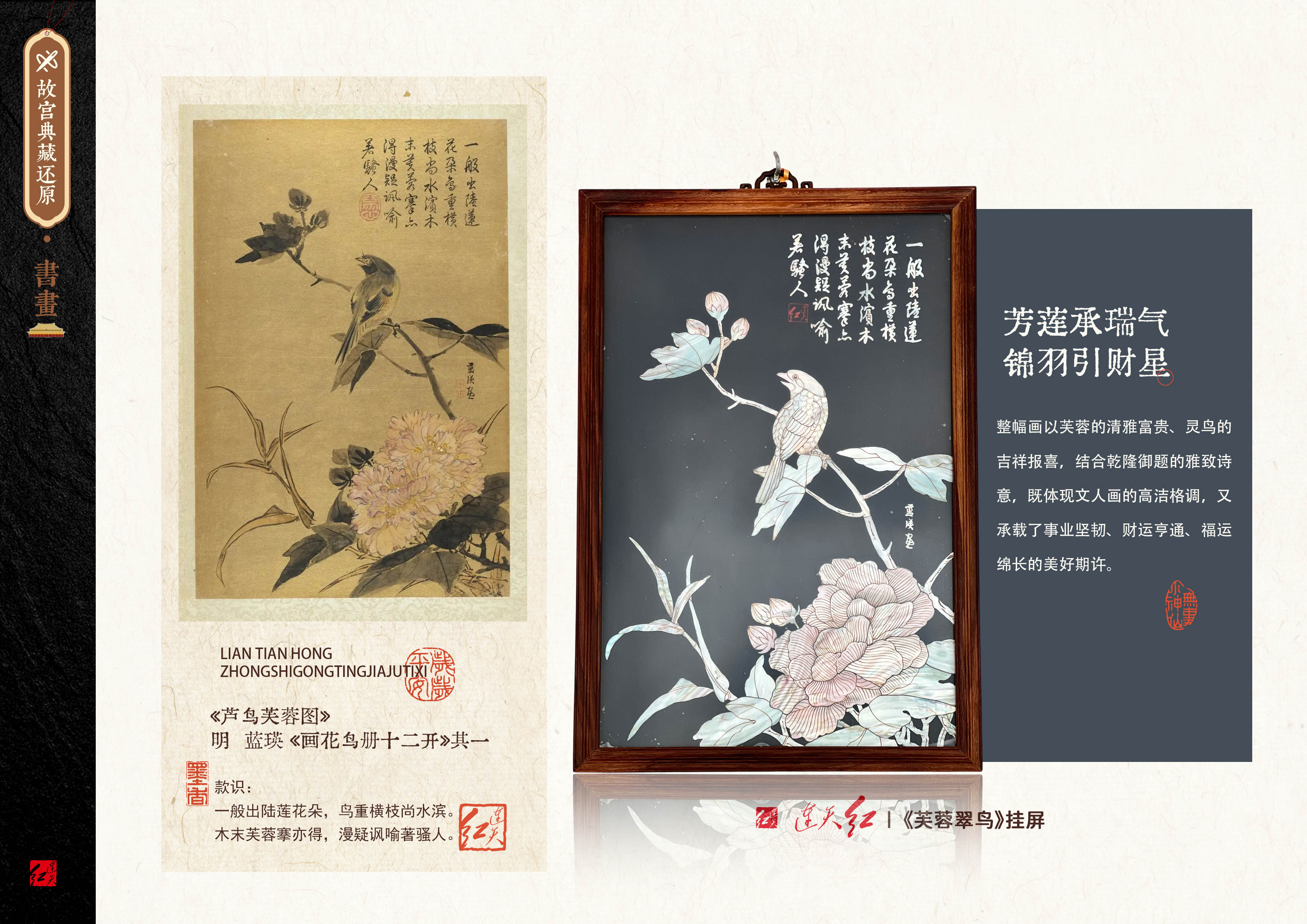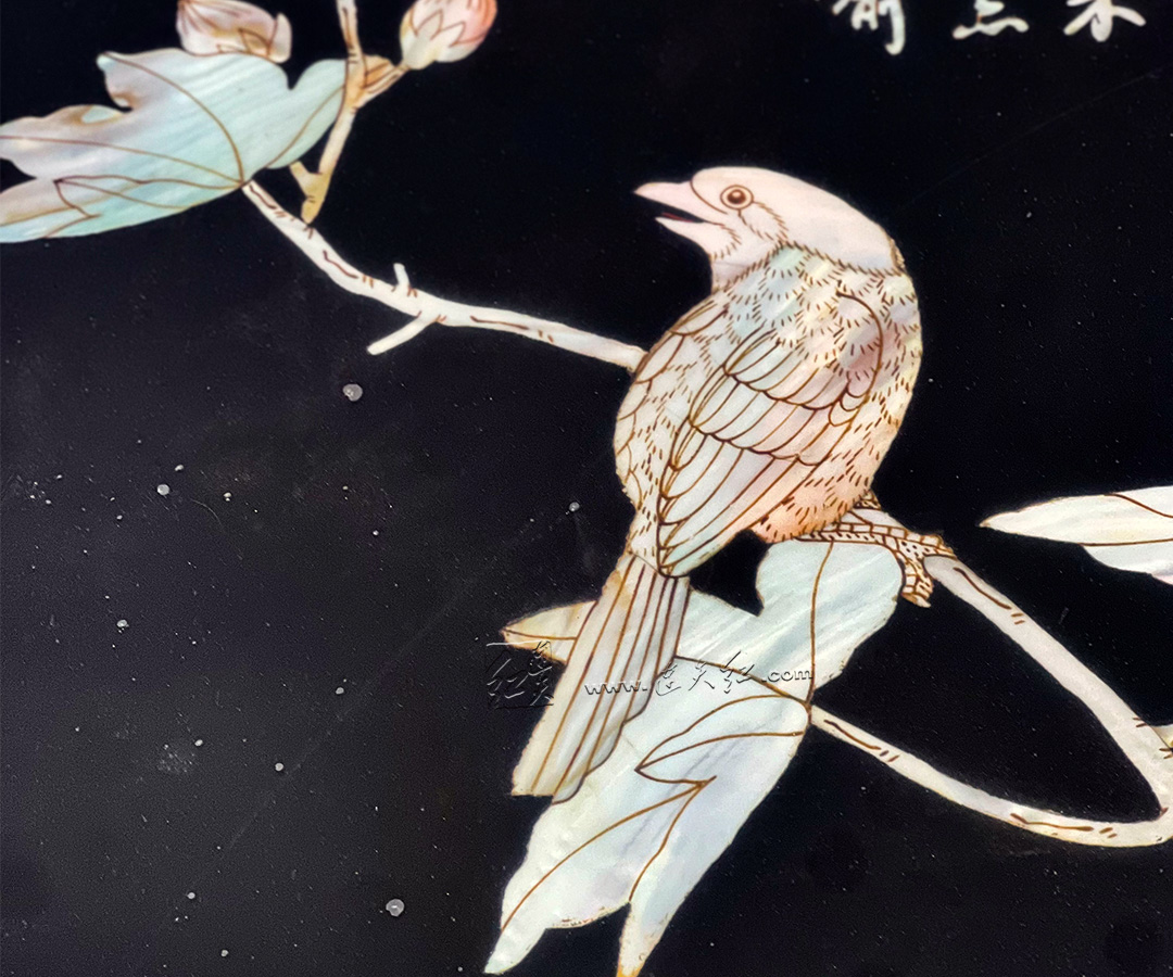 此件挂屏以国家级非遗平磨螺钿工艺为骨,以「芙蓉花鸟」为经典主题:芙蓉花盛开繁茂,花瓣层叠细腻,叶脉清晰;枝头禽鸟昂首啼鸣,栩栩如生,仿佛能闻花香、听鸟鸣。