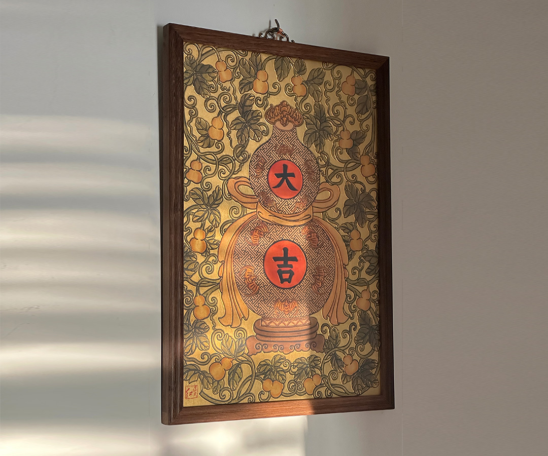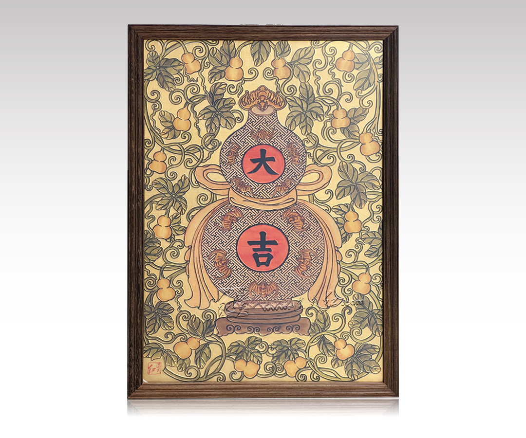 背景装饰:缠枝葫芦藤蔓环绕,满屏的吉祥元素让挂屏兼具观赏性与祝福寓意。