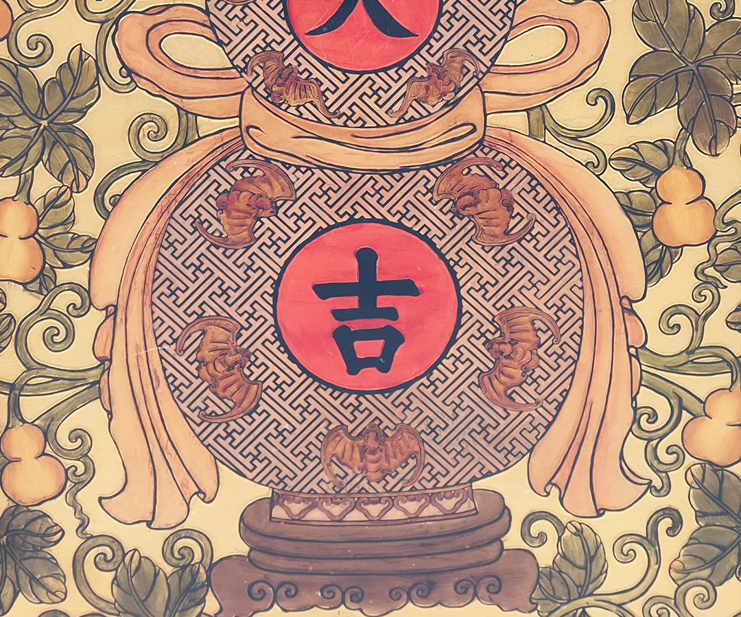 主体纹样:双层葫芦造型搭配 “大吉” 字样,葫芦谐音 “福禄”,辅以蝙蝠纹饰(寓意 “福”),传递福禄双全、吉祥顺遂的美好祈愿。