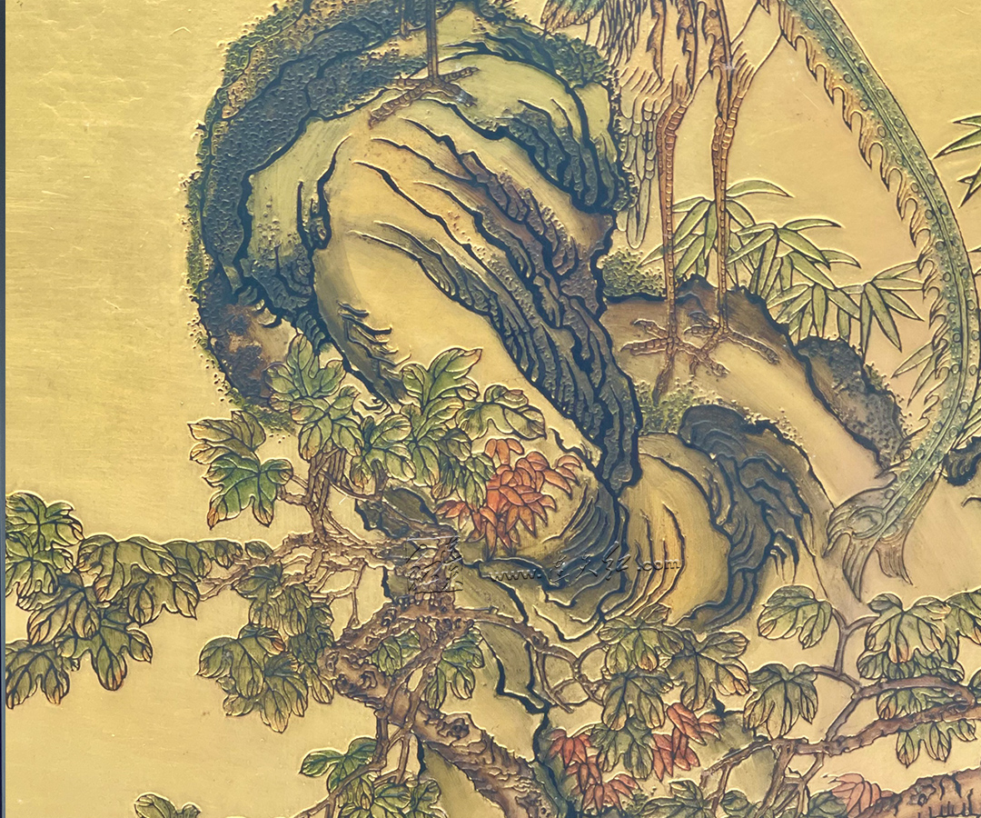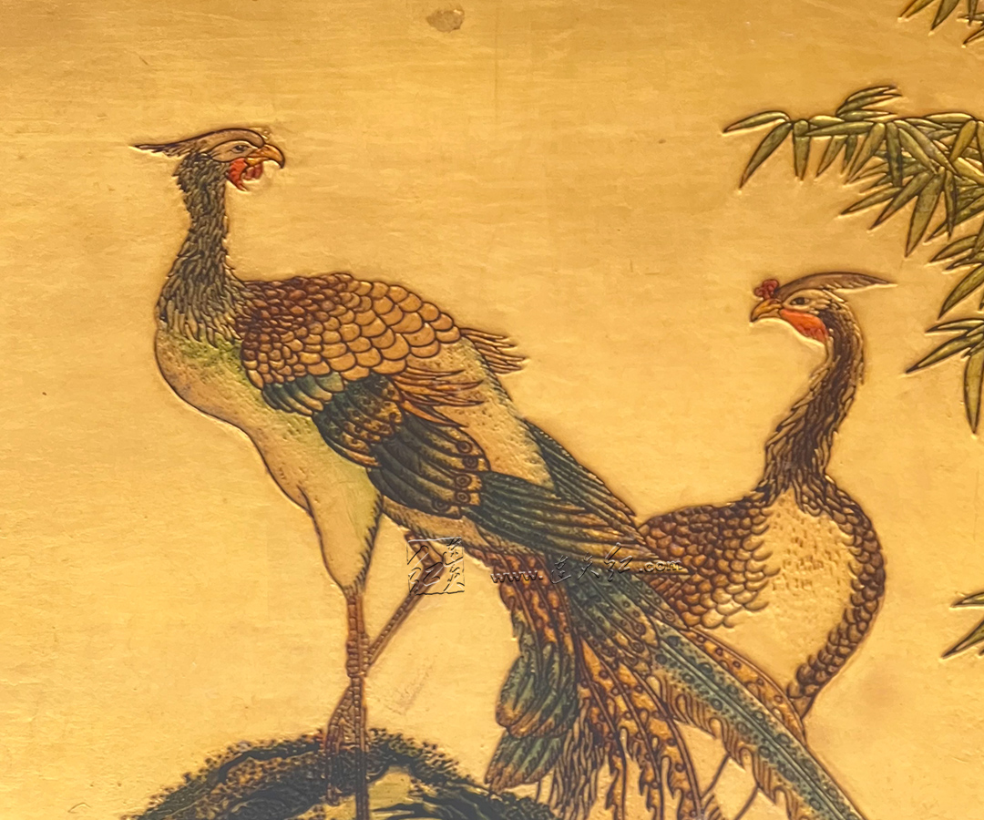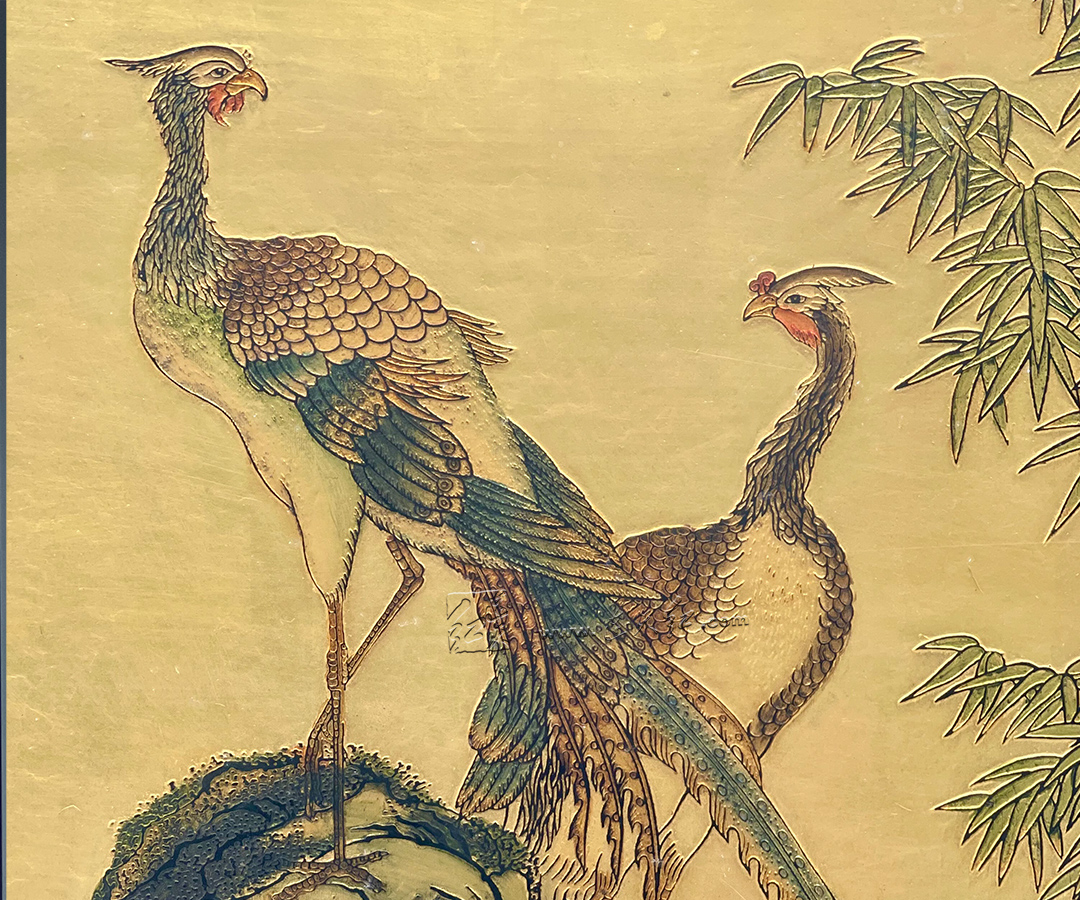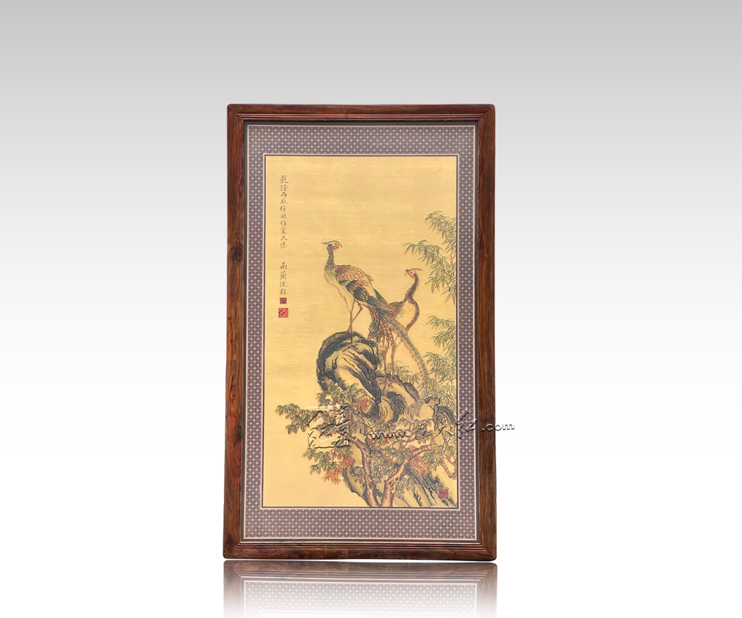 此挂屏以金箔为底,铺陈华贵底色,复刻清乾隆年间沈铨【绘孔雀图轴】,绘就双凤栖于岩上、翠竹旁立的祥瑞图景。凤羽层次分明,长尾曳曳生姿,丹顶朱喙,顾盼生辉;旁侧修竹摇曳、嘉木垂荫,山石苍劲,尽显 “凤鸣于山,和鸣于林” 的清雅与祥瑞。
