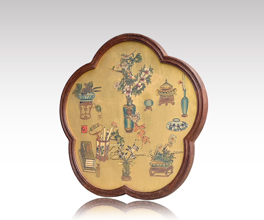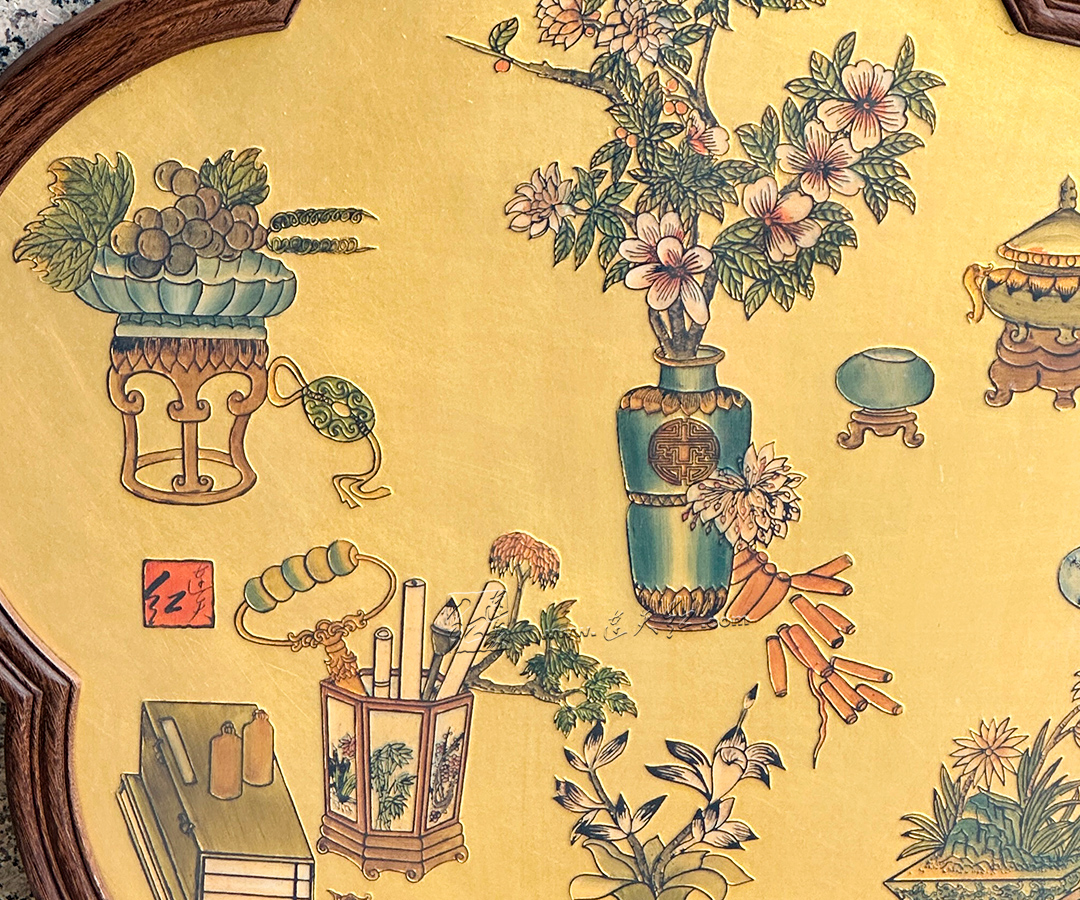 取法清代宫廷博古挂屏,以金为底,绘文房雅器、四时清供。瓶花吐艳,炉烟袅袅,书卷与笔砚错落,将文人 “案头清供” 的闲情逸致凝于一屏。既是空间装饰,亦是可传家的文化藏品,藏着中式生活的雅致与从容。