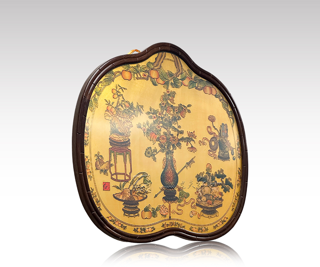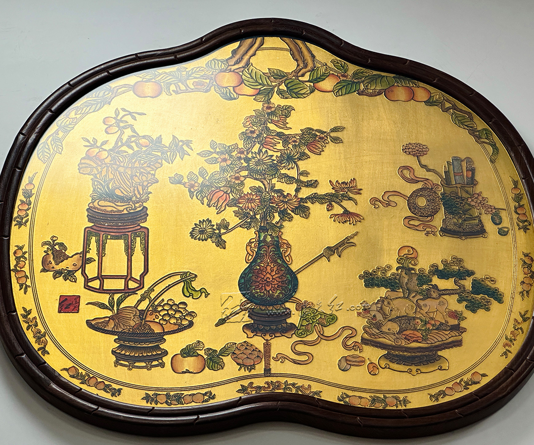 画面的海棠形轮廓、描金底色、取清代宫廷 “岁朝清供” 之雅意,将古瓶、盆花、吉祥花果与文房清玩汇于一屏: