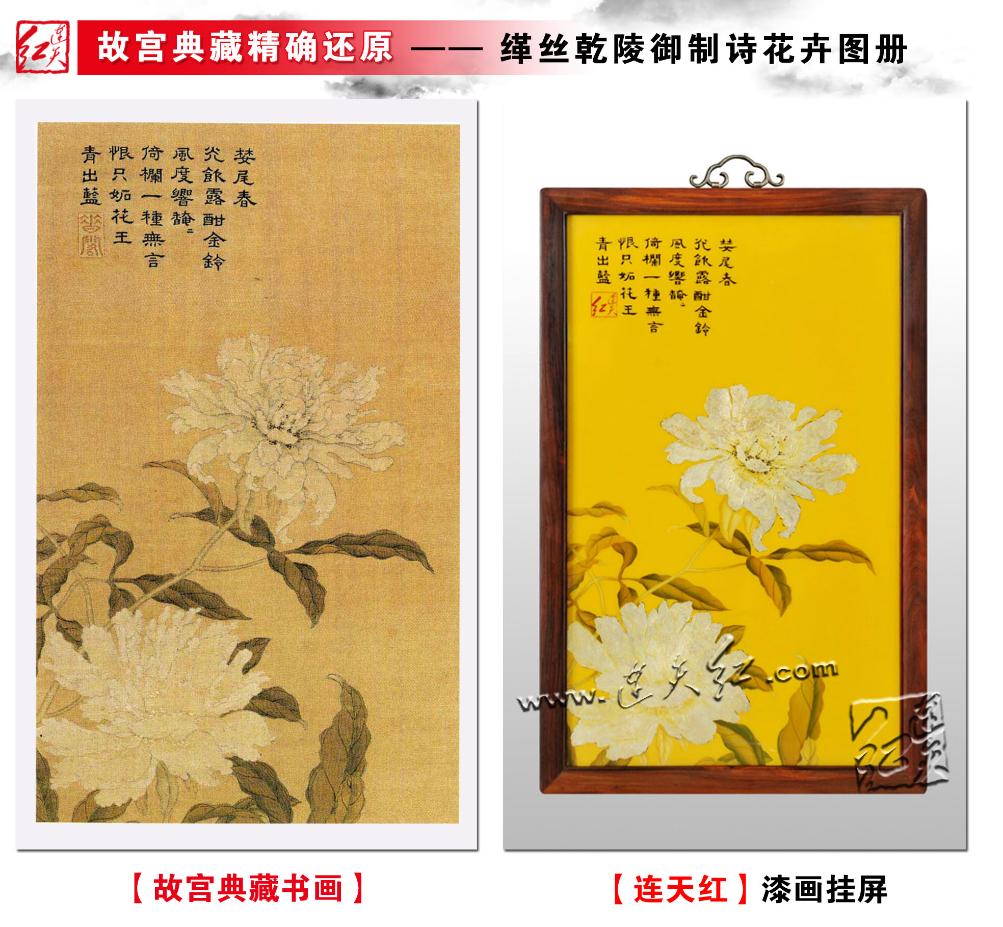 此挂件以金色为底,四周衬以小花边。作品雕以花型饱满,花叶线条清晰的婪尾春(即古人谓之芍药),其色彩艳丽,但又不失素雅之气。属清代“院体”花鸟画流行风格。