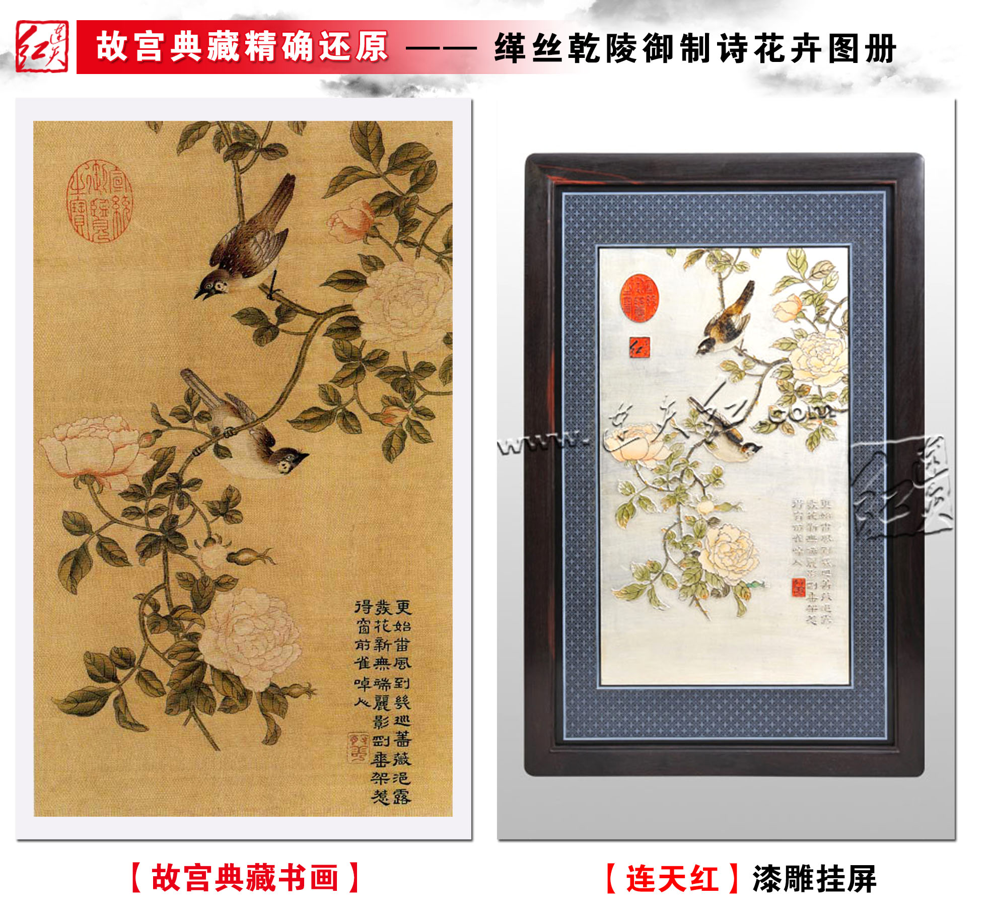 此挂件色彩素雅,属清代“院体”花鸟画流行风格。画面上一株花型饱满的月季花,月季花有四季平安之意。两只山雀停以月季花上,嬉戏玩耍,好不热闹。