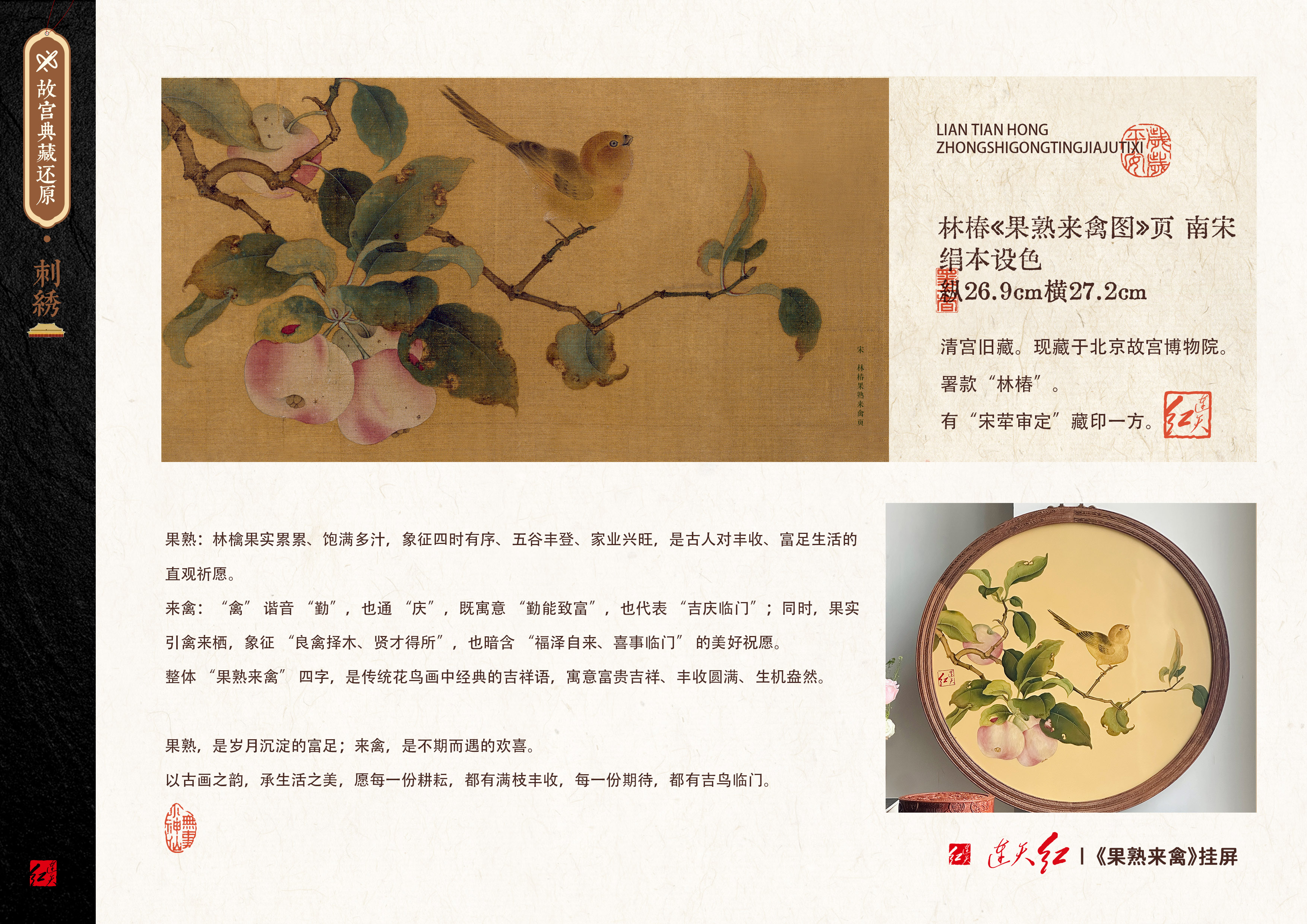 此画出自林椿,人工画花鸟。《果熟来禽图》画面构图采取稳定的三角形,从左端上部四分之一处到右下角,被一枝优美饱满的檎果所占据。树叶错落有致,连阴、阳面、叶柄转承等细节都一一罗列。果枝上栖息着一只小雀,其视线向着右上方,似有飞跃之意。小鸟可谓画中的点睛之笔,起到统领全局的作用。系挂着沉甸甸果实的枝柯,仿佛在轻轻地颤动。果叶正反面刻画细织,连虫蚀的痕迹都颇为清晰。画面虽不繁复,却充满生气盎然的意趣。全图笔法精工,设色妍美,是面宋初期花乌画的佳作。