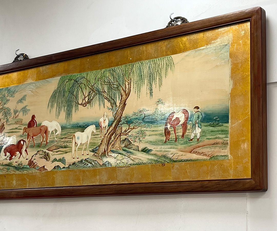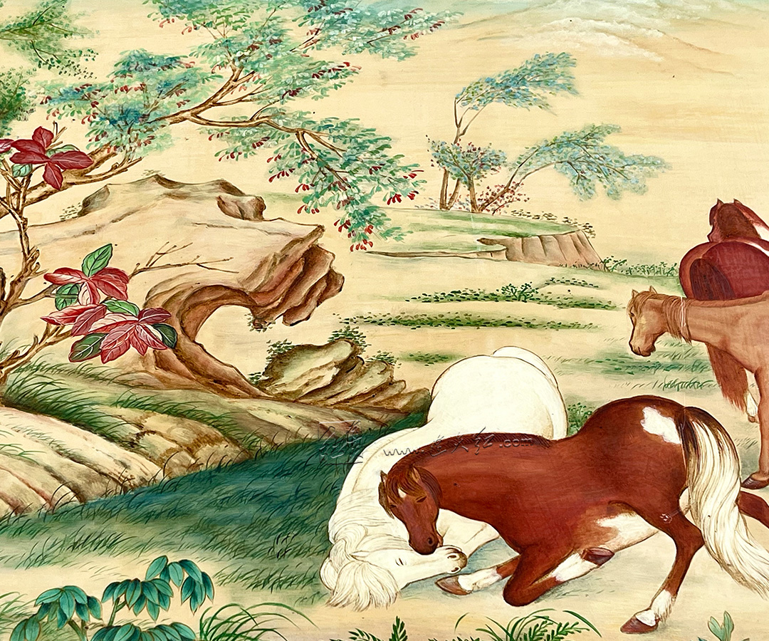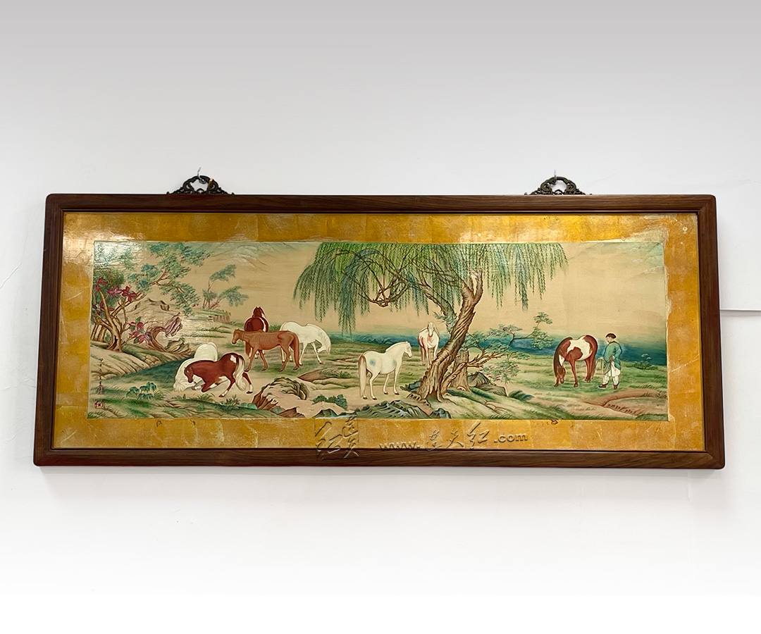 此款挂屏取法清代宫廷画师郎世宁经典名作《郊原牧马图》(又称《八骏图》),以工笔重彩复刻传世经典,融中西画技于一器,载千年文化于一室。