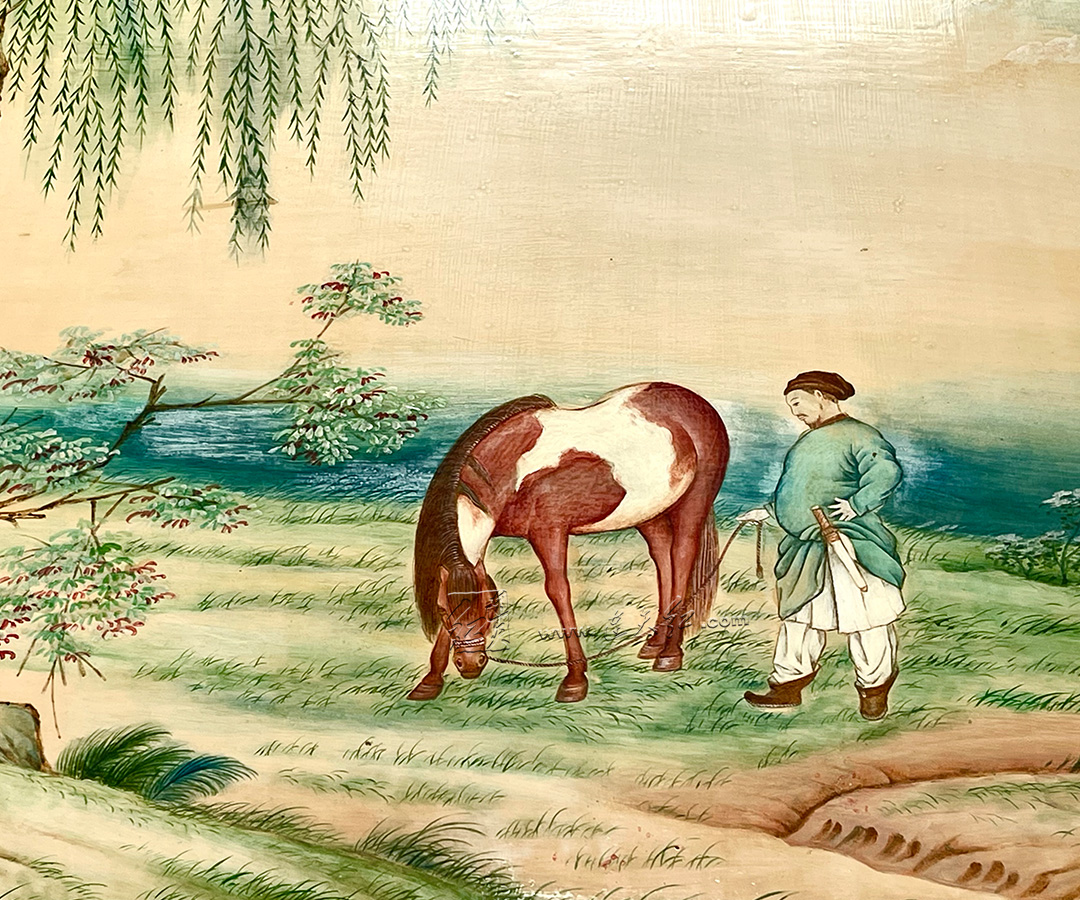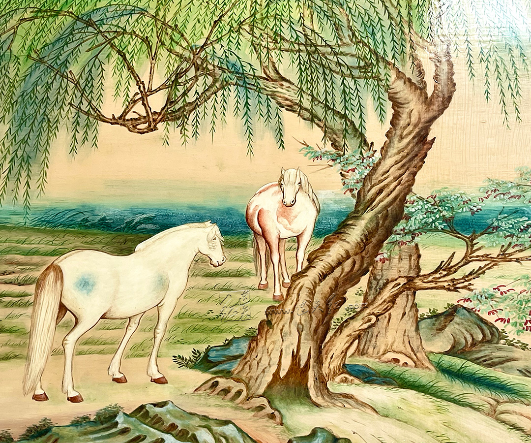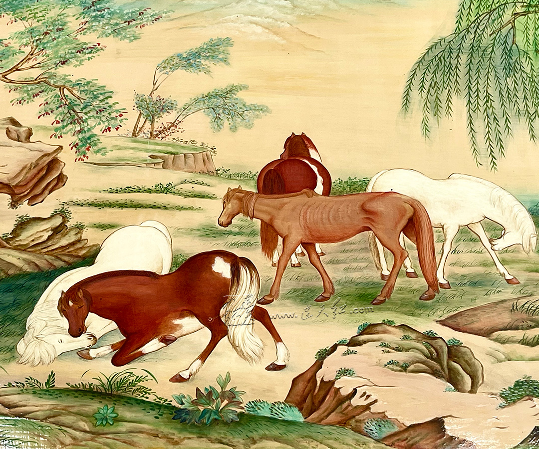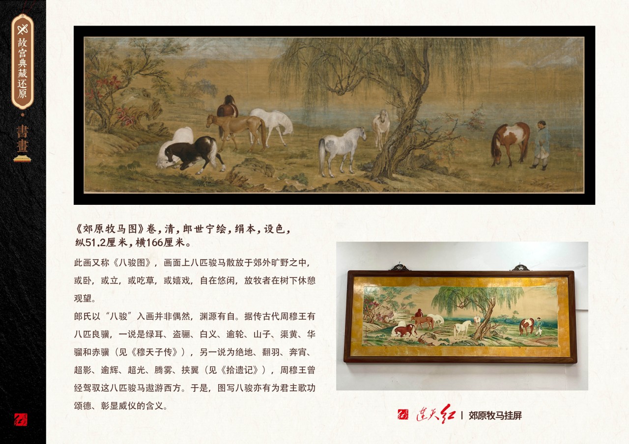 此款挂屏取法清代宫廷画师郎世宁经典名作《郊原牧马图》(又称《八骏图》),以工笔重彩复刻传世经典,融中西画技于一器,载千年文化于一室。