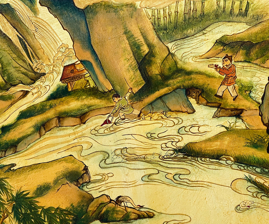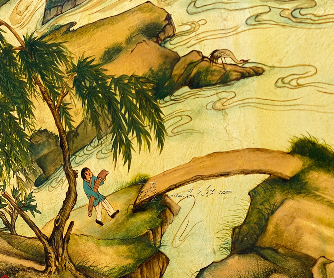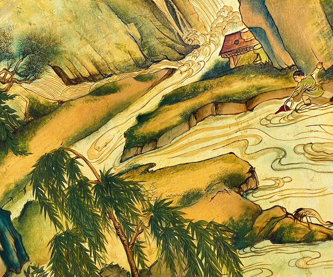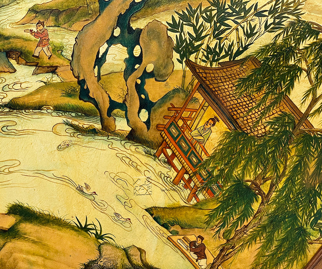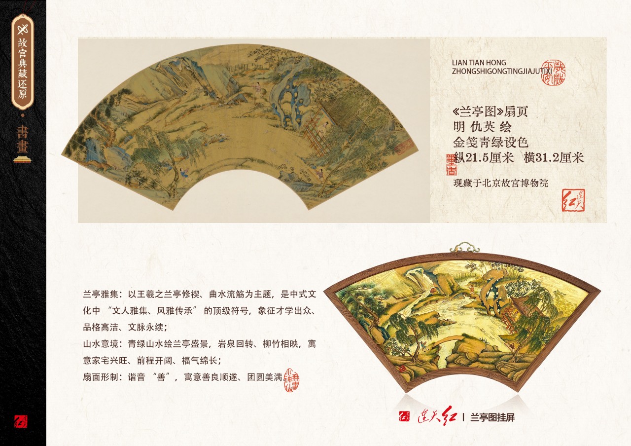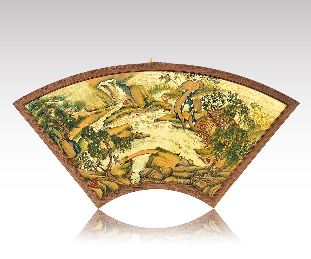 画中溪泉奔流、青山叠翠,亭台隐于竹柳之间,渔樵耕读、童叟嬉游,尽显 “世外桃源” 的太平盛景。在中国传统文化中,山水象征基业稳固、财源广进,流水寓意生生不息、福运绵长;渔樵耕读的意象,承载着国泰民安、阖家安康的美好祈愿,更暗含 “顺风顺水、衣食无忧” 的生活愿景。扇面形制自带 “纳福迎祥、事事顺遂” 的吉祥意涵,金箔衬底更添华贵之气,实木装框尽显厚重质感。