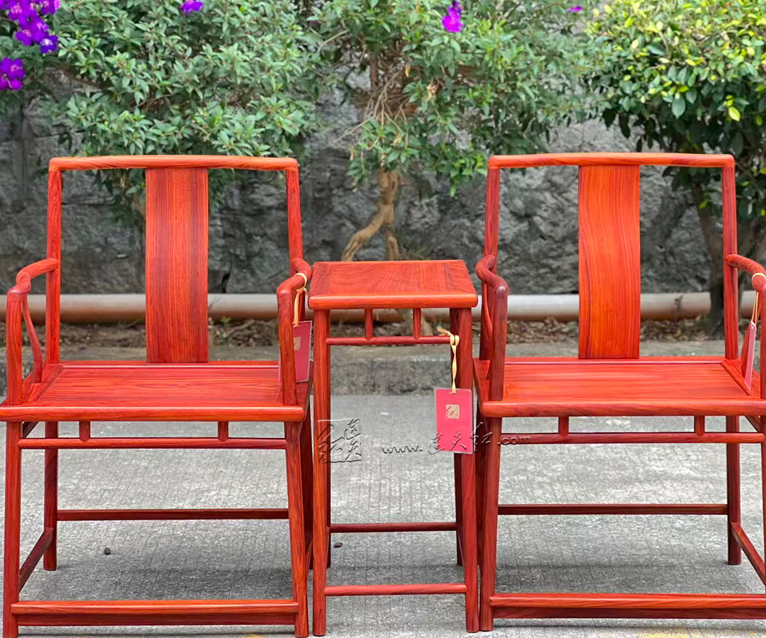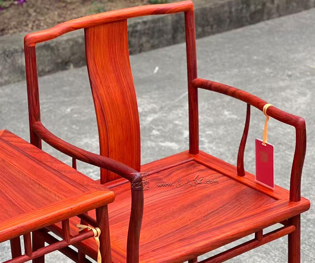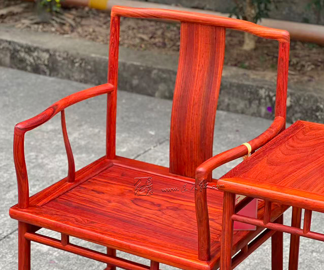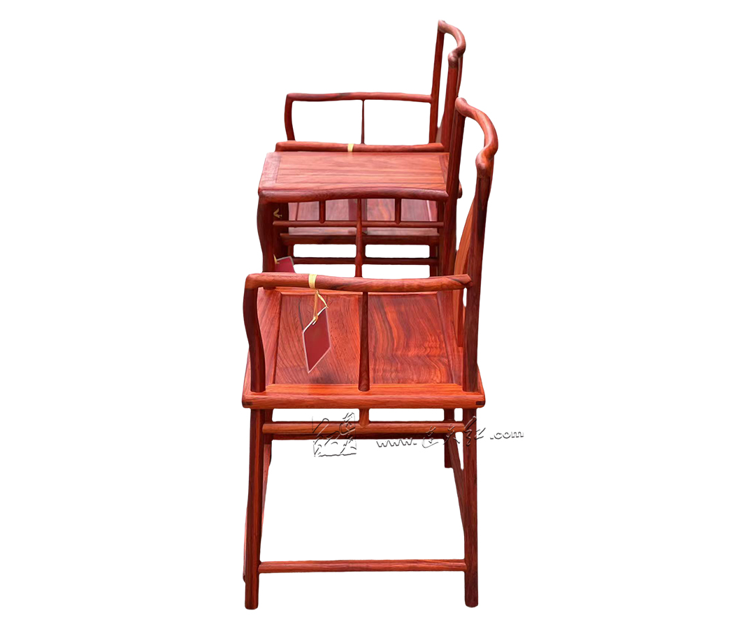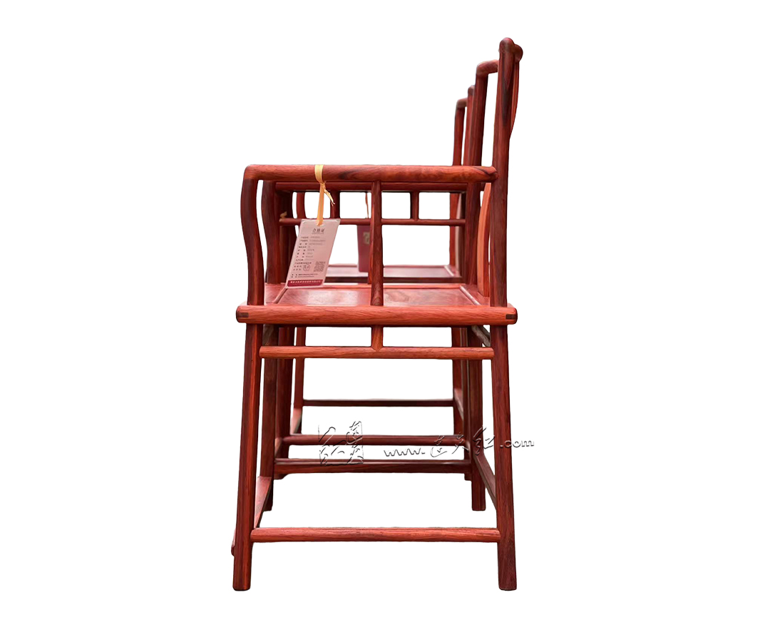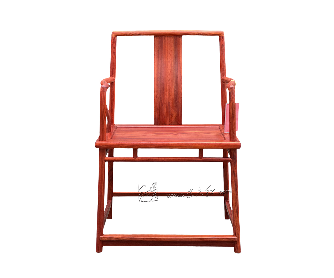 椅子靠背板、扶手、鹅脖、联帮棍均成曲形,特别是联帮棍上细下粗,后背板作成“S”形。座面下装罗锅枨加矮佬,直腿,侧脚收分明显。腿间安管脚枨,左右及正面为双枨,后面安单枨。